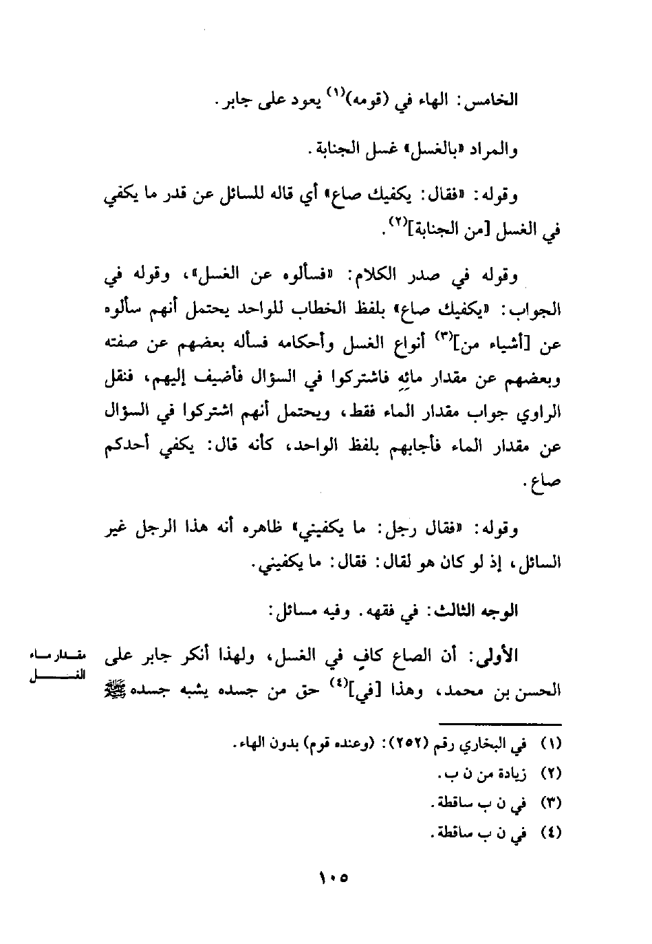 وقوله في صدر الكلام: "فسألوه عن الغسل"، وقوله في الجواب: "يكفيك صاع" بلفظ الخطاب للواحد يحتمل أنهم سألوه