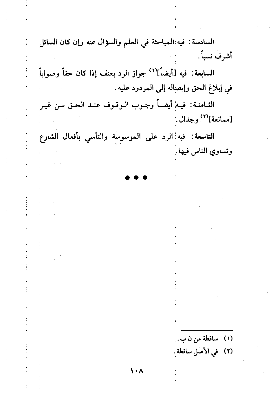 السادسة: فيه المباحثة في العلم والسؤال عنه وإن كان السائل أشرف نسبًا.