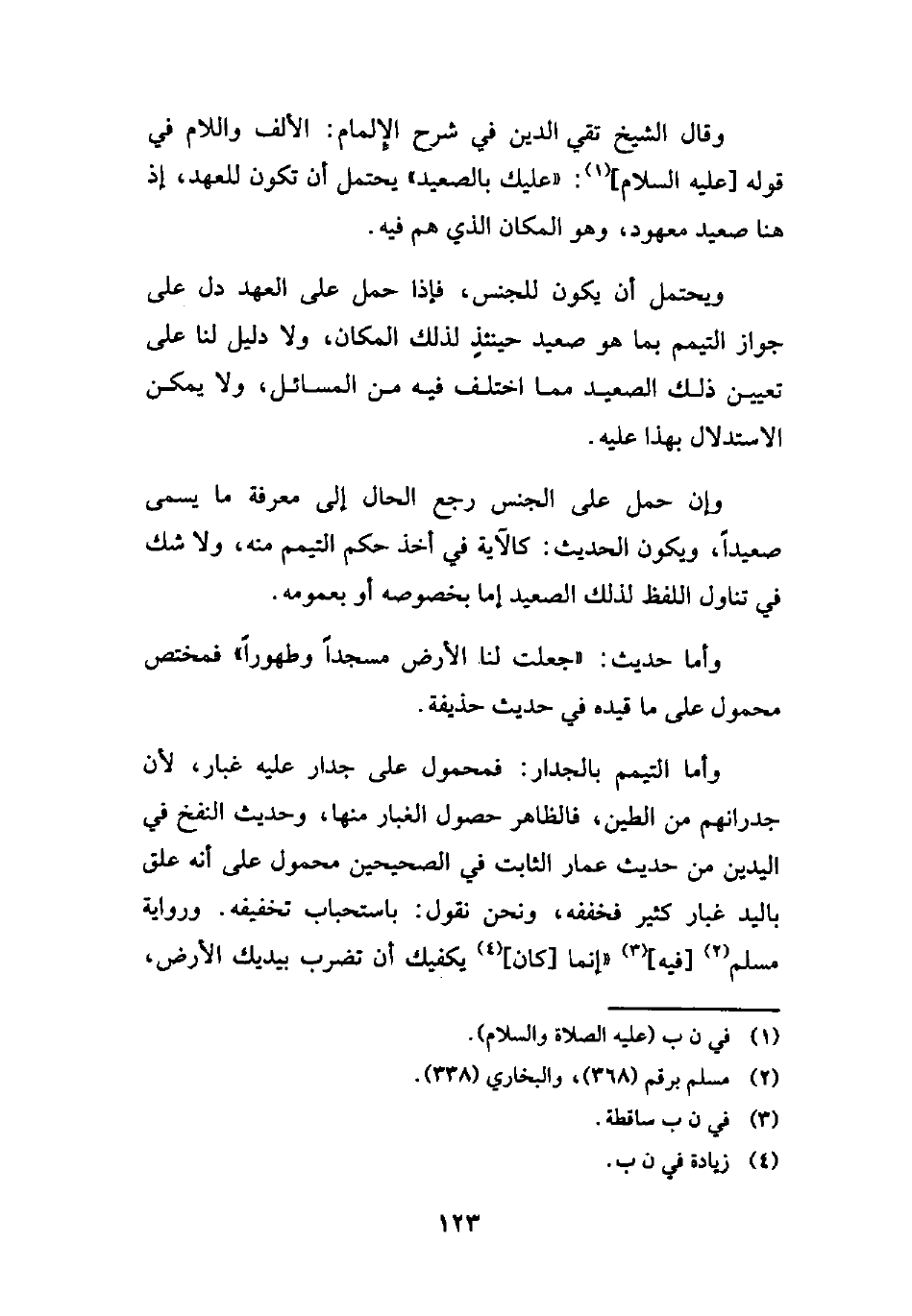 وقال الشيخ تقي الدين في شرح الإِلمام: الألف واللام في قوله [عليه السلام] (¬1): "عليك بالصعيد" يحتمل أن تكون للعهد، إذ هنا صعيد معهود، وهو المكان الذي هم فيه.