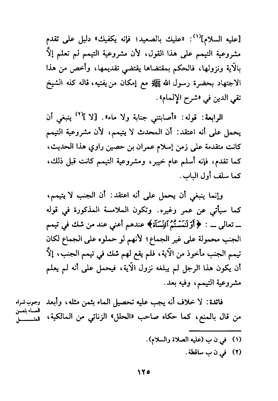 الرابعة: قوله: "أصابتني جنابة ولا ماء". [لا] (¬2) ينبغي أن يحمل على أنه اعتقد: أن المحدث لا يتيمم، لأن مشروعية التيمم كانت متقدمة على زمن إسلام عمران بن حصين راوي هذا الحديث، كما تقدم، فإنه أسلم عام خيبر، ومشروعية التيمم كانت قبل ذلك، كما سلف أول الباب.