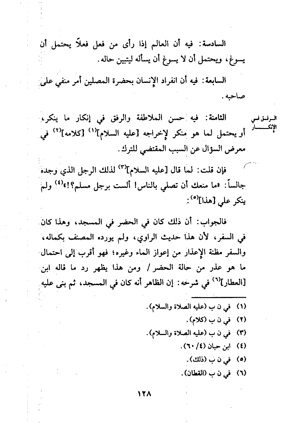 السادسة. فيه أن العالم إذا رأى من فعل فعلًا يحتمل أن يسوغ، ويحتمل أن لا يسوغ أن يسأله ليتبين حاله.