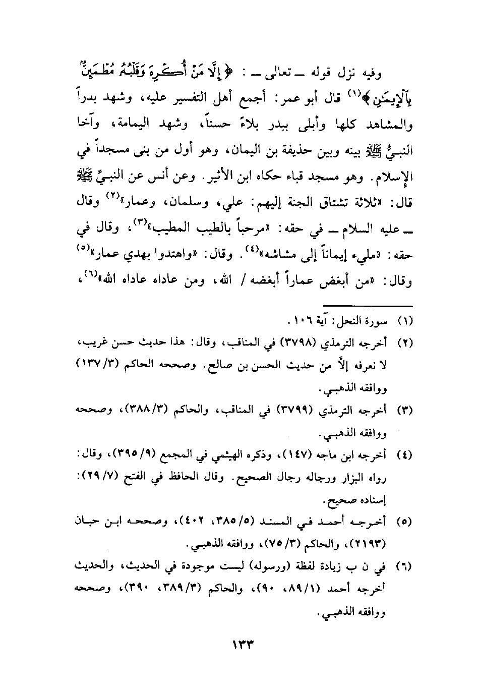 وفيه نزل قوله -تعالى-: {إِلَّا مَنْ أُكْرِهَ وَقَلْبُهُ مُطْمَئِنٌّ بِالْإِيمَانِ} (¬1) قال أبو عمر: أجمع أهل التفسير عليه، وشهد بدرًا والمشاهد كلها وأبلى ببدر بلاءً حسنًا، وشهد اليمامة، وآخا النبيُّ - صلى الله عليه وسلم - بينه وبين حذيفة بن اليمان، وهو أول من بنى مسجدًا في الإِسلام. وهو مسجد قباء حكاه ابن الأثير. وعن أنس عن النبيِّ - صلى الله عليه وسلم - قال: "ثلاثة تشتاق الجنة إليهم: علي، وسلمان، وعمار" (¬2) وقال -عليه السلام- في حقه: "مرحبًا بالطيب المطيب" (¬3)، وقال في حقه: "مليء إيمانًا إلى مشاشه" (¬4). وقال: "واهتدوا بهدي عمار" (¬5) وقال: "من أبغض عمارًا أبغضه الله، ومن عاداه عاداه الله" (¬6)،