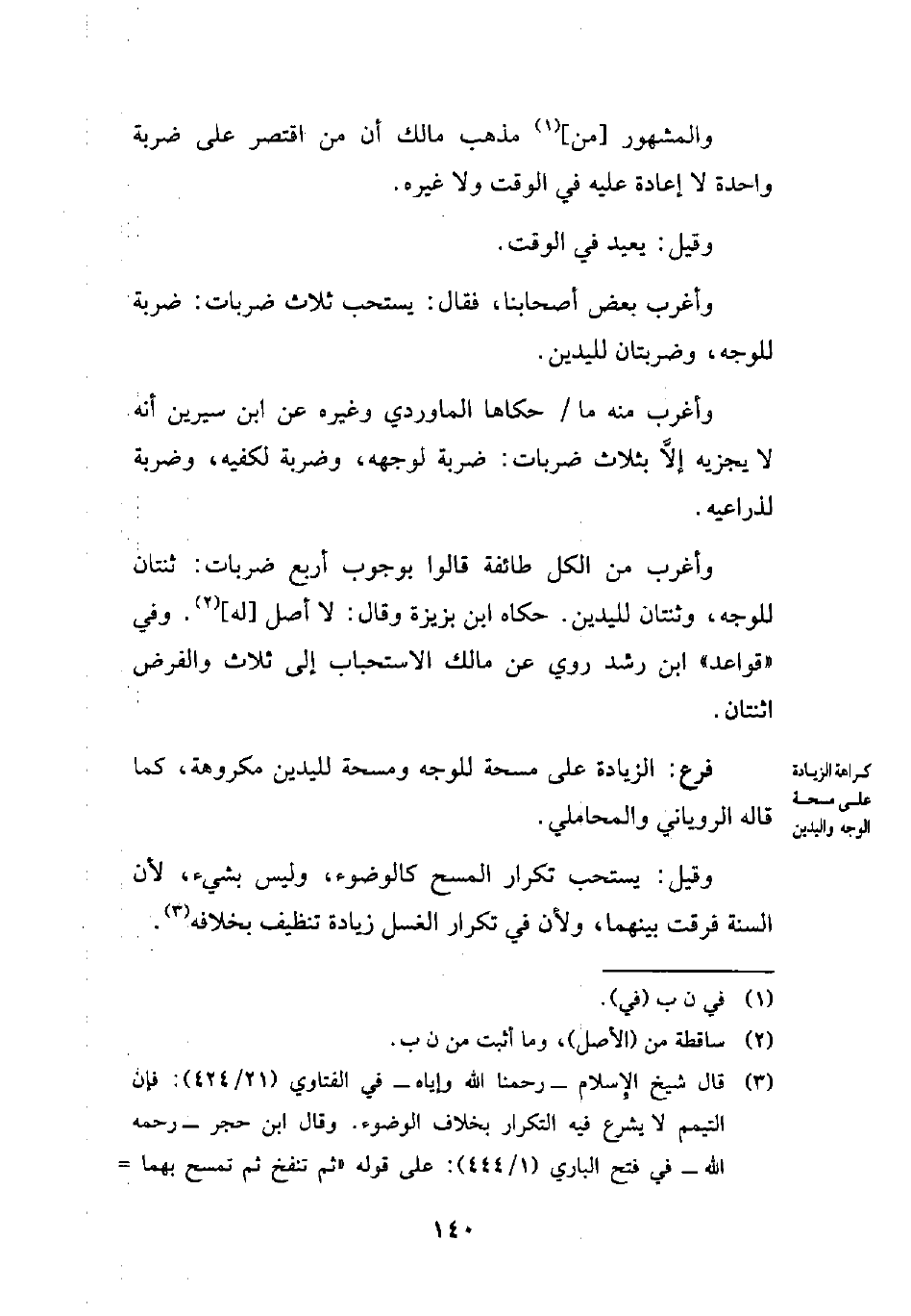 وأغرب منه ما حكاها الماوردي وغيره عن ابن سيرين أنه لا يجزيه إلَّا بثلاث ضربات: ضربة لوجهه، وضربة لكفيه، وضربة