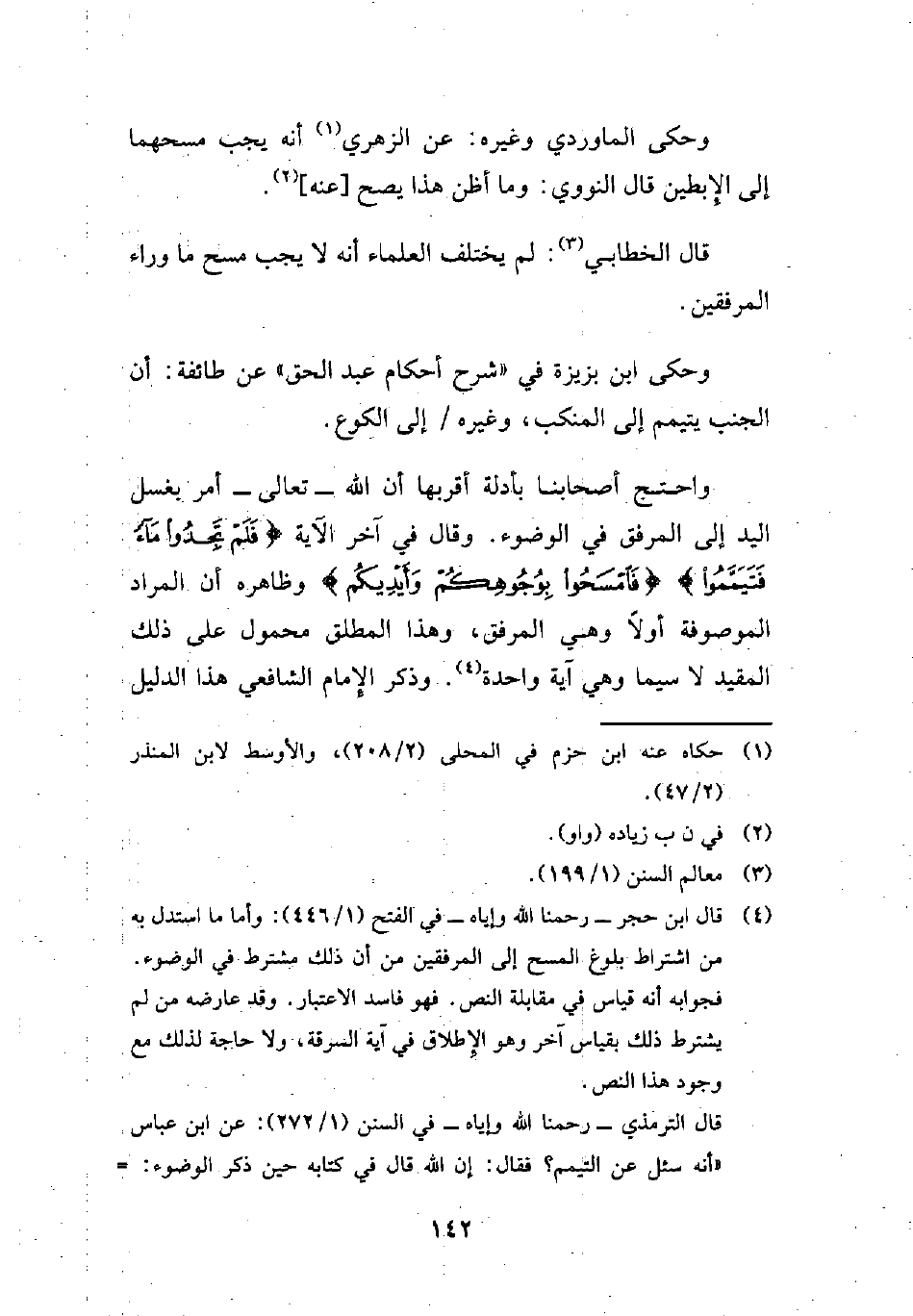(¬4) قال ابن حجر -رحمنا الله وإياه- في الفتح (1/ 446): وأما ما استدل به من اشتراط بلوغ المسح إلى المرفقين من أن ذلك مشترط في الوضوء. فجوابه أنه قياس في مقابلة النص. فهو فاسد الاعتبار. وقد عارضه من لم يشترط ذلك بقياس آخر وهو الإِطلاق في آية السرقة، ولا حاجة لذلك مع وجود هذا النص.
