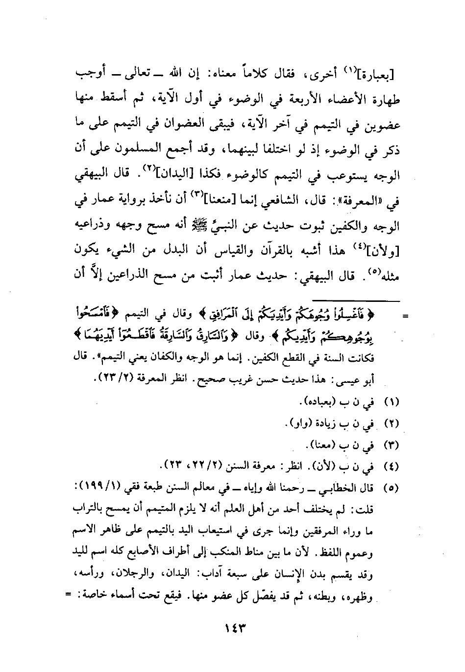 = {فَاغْسِلُوا وُجُوهَكُمْ وَأَيْدِيَكُمْ إِلَى الْمَرَافِقِ} وقال في التيمم {فَامْسَحُوا بِوُجُوهِكُمْ وَأَيْدِيكُمْ}. وقال {وَالسَّارِقُ وَالسَّارِقَةُ فَاقْطَعُوا أَيْدِيَهُمَا} فكانت السنة في القطع الكفين. إنما هو الوجه والكفان يعني التيمم". قال أبو عيسى: هذا حديث حسن غريب صحيح. انظر المعرفة (2/ 23).