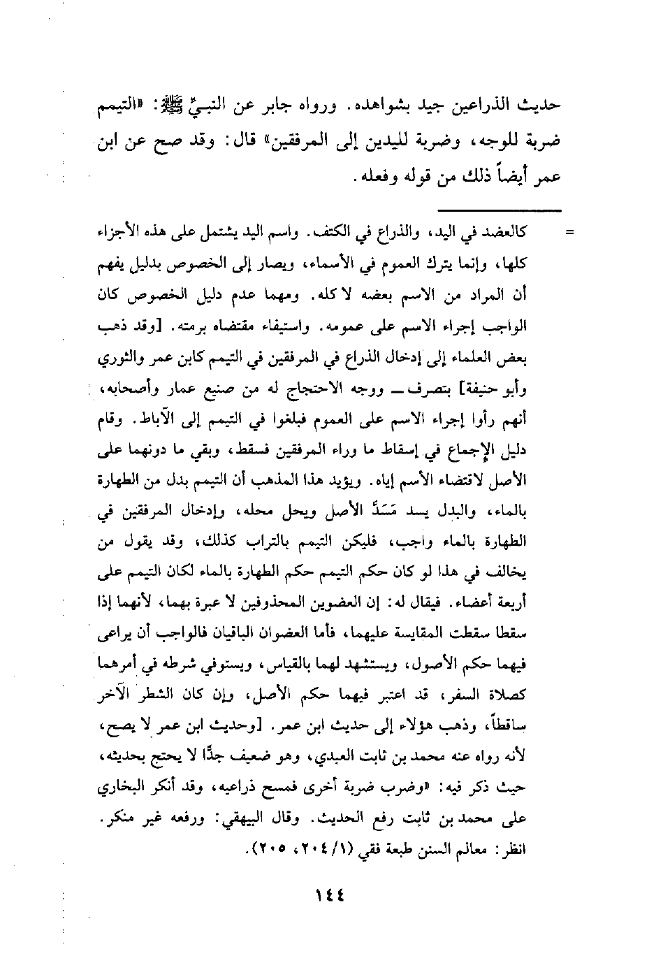 حديث الذراعين جيد بشواهده. ورواه جابر عن النبي - صلى الله عليه وسلم -: "التيمم ضربة للوجه، وضربة لليدين إلى المرفقين" قال: وقد صح عن ابن عمر أيضًا ذلك من قوله وفعله.