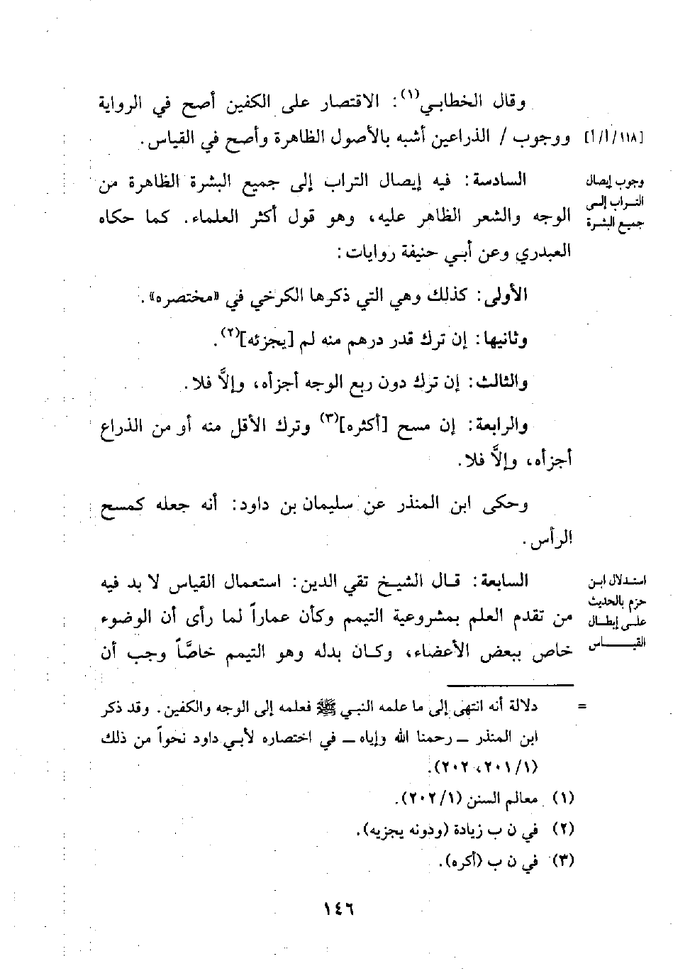 = دلالة أنه انتهى إلى ما علمه النبي - صلى الله عليه وسلم - فعلمه إلى الوجه والكفين. وقد ذكر ابن المنذر -رحمنا الله وإياه- في اختصاره لأبي داود نحوًا من ذلك (1/ 201، 202).