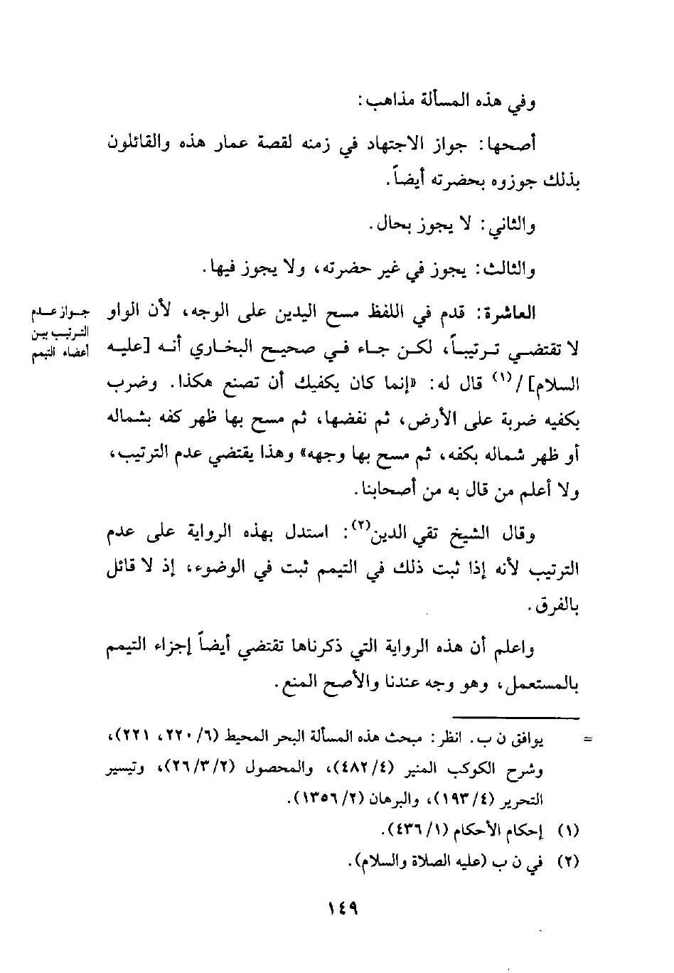 العاشرة: قدم في اللفظ مسح اليدين على الوجه، لأن الواو لا تقتضي ترتيبًا، لكن جاء في صحيح البخاري أنه [عليه السلام] (¬1) قال له: "إنما كان يكفيك أن تصنع هكذا. وضرب بكفيه ضربة على الأرض، ثم نفضها، ثم مسح بها ظهر كفه بشماله أو ظهر شماله بكفه، ثم مسح بها وجهه" وهذا يقتضي عدم الترتيب، ولا أعلم من قال به من أصحابنا.