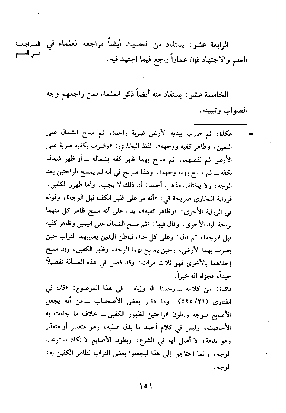 فائدة: من كلامه -رحمنا الله وإِياه- في هذا الموضوع: "قال في الفتاوى (21/ 425): وما ذكر بعض الأصحاب -من أنه يجعل الأصابع للوجه وبطون الراحتين لظهور الكفين- خلاف ما جاءت به الأحاديث، وليس في كلام أحمد ما يدل عليه، وهو متعسر أو متعذر وهو بدعة، لا أصل لها في الشرع، وبطون الأصابع لا تكاد تستوعب الوجه، وإنما احتاجوا إلى هذا ليجعلوا بعض التراب لظاهر الكفين بعد الوجه.