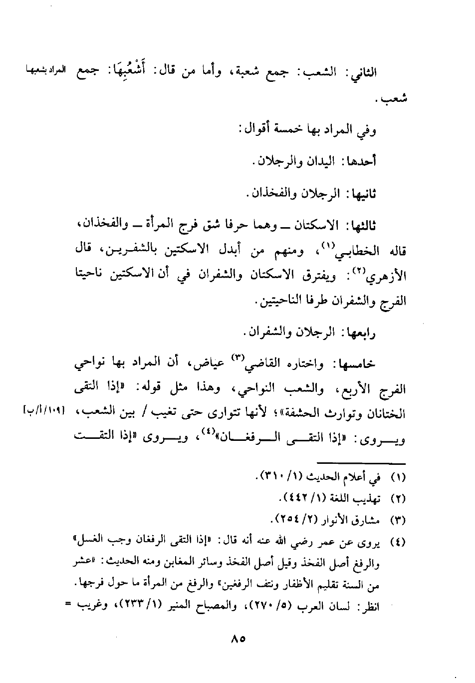 خامسها: واختاره القاضي (¬3) عياض، أن المراد بها نواحي الفرج الأربع، والشعب النواحي، وهذا مثل قوله: "إذا التقى الختانان وتوارث الحشفة"؛ لأنها تتوارى حتى تغيب بين الشعب، ويروى: "إذا التقى الرفغان" (¬4)، ويروى "إذا التقت
