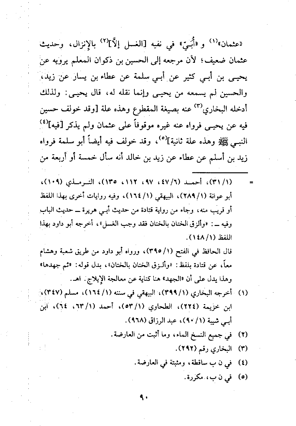 "عثمان" (¬1) و "أُبيِّ" في نفيه [الغسل إلَّا] (¬2) بالإِنزال، وحديث عثمان ضعيف، لأن مرجعه إلى الحسين بن ذكوان المعلم يرويه عن يحيى بن أبي ك ثير عن أبي سلمة عن عطاء بن يسار عن زيد، والحسين لم يسمعه من يحيى وإنما نقله له، قال يحيى: ولذلك أدخله البخاري (¬3) عنه بصيغة المقطوع وهذه علة [وقد خولف حسين فيه عن يحيى فرواه عنه غيره موقوفًا على عثمان ولم يذكر [فيه] (¬4) النبي - صلى الله عليه وسلم - وهذه علة ثانية] (¬5)، وقد خولف فيه أيضًا أبو سلمة فرواه زيد بن أسلم عن عطاء عن زيد بن خالد أنه سأل خمسة أو أربعة من