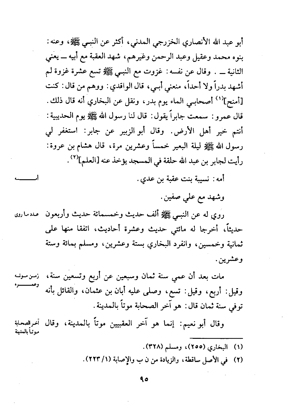 أبو عبد الله الأنصاري الخزرجي المدني، أكثر عن النبي - صلى الله عليه وسلم -، وعنه: بنوه محمد وعقيل وعبد الرحمن وغيرهم، شهد العقبة مع أبيه -يعني الثانية-. وقال عن نفسه: غزوت مع النبي - صلى الله عليه وسلم - تسع عشرة غزوة لم