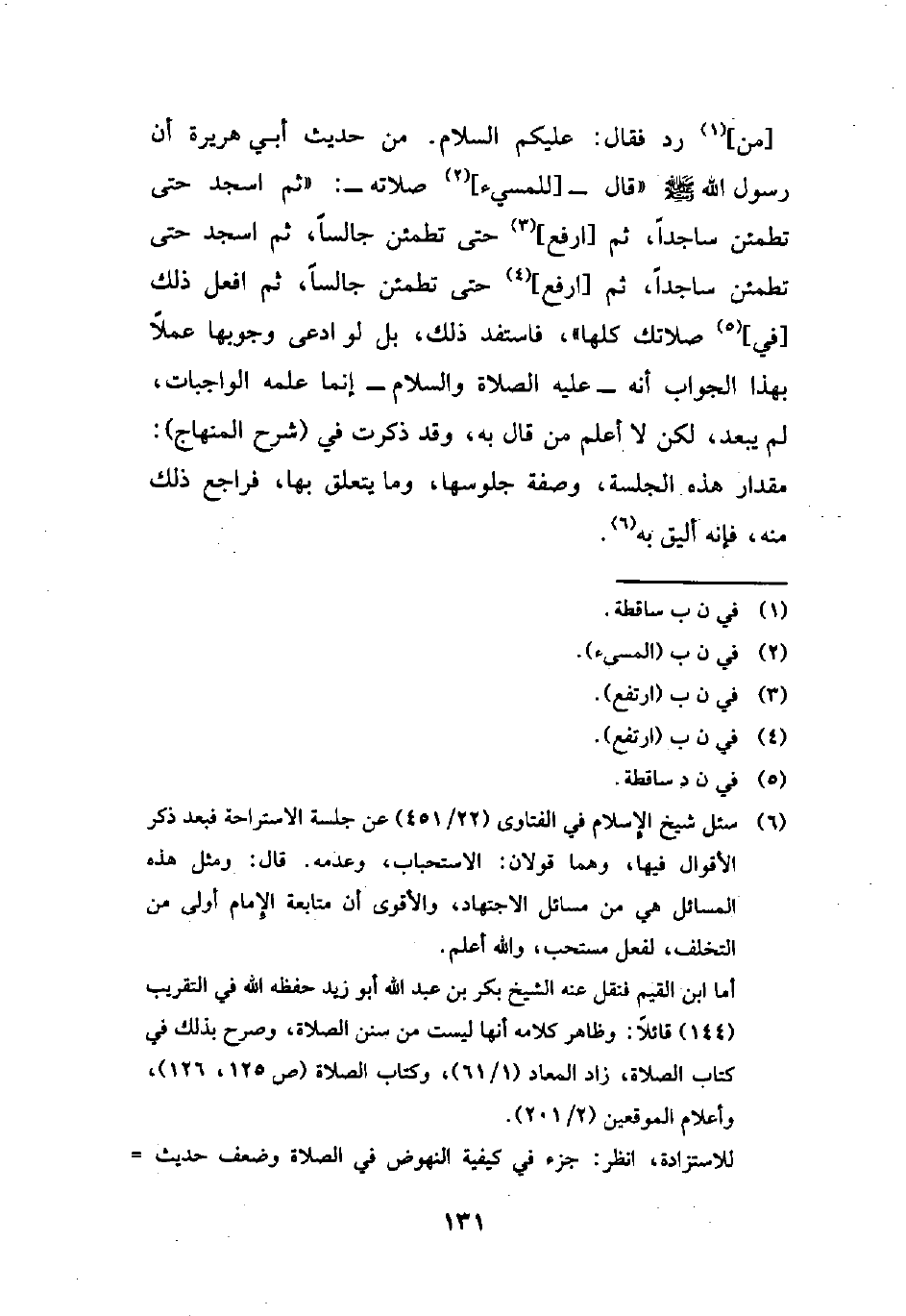 (¬6) سئل شيخ الإِسلام في الفتاوى (22/ 451) عن جلسة الاستراحة فبعد ذكر الأقوال فيها، وهما قولان: الاستحباب، وعدمه. قال: ومثل هذه المسائل هي من مسائل الاجتهاد، والأقوى أن متابعة الإِمام أولى من التخلف، لفعل مستحب، والله أعلم.