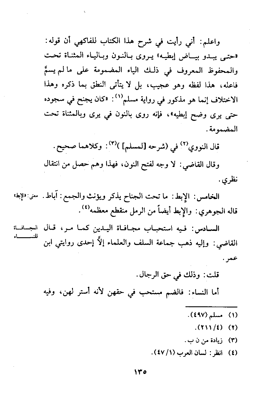 واعلم: أني رأيت في شرح هذا الكتاب للفاكهي أن قوله: "حتى يبدو بياض إبطيه" يروى بالنون وبالياء المثناة تحت والمحفوظ المعروف في ذلك الياء المضمومة على ما لم يسم فاعله، هذا لفظه وهو عجيب، بل لا يتأتى النطق بما ذكره وهذا الاختلاف إنما هو مذكور في رواية مسلم (¬1): "كان يجنح في سجوده حتى يرى وضح إبطيه"، فإنه روى بالنون في يرى وبالمثناة تحت المضمومة.