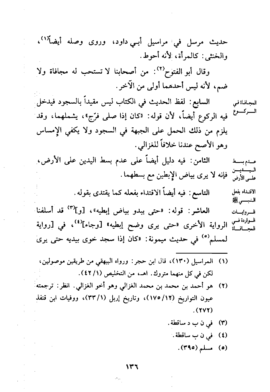 السابع: لفظ الحديث في الكتاب ليس مقيدًا بالسجود فيدخل فيه الركوع أيضًا، لأن قوله: "كان إذا صلى فرّج"، يشملهما، وقد يلزم من ذلك الحمل على الجبهة في السجود ولا يكفي الإِمساس وهو الأصح عندنا خلافًا للغزالي.