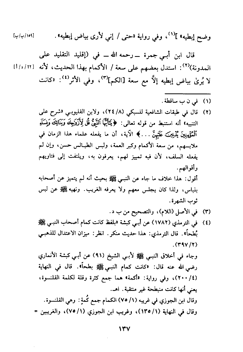 (¬2) قال في طبقات الشافعية للسبكي (8/ 24)، ولابن القليوبي "شرح على التنبيه" أنه استنبط من قوله تعالى: {يَا أَيُّهَا النَّبِيُّ قُلْ لِأَزْوَاجِكَ وَبَنَاتِكَ وَنِسَاءِ الْمُؤْمِنِينَ يُدْنِينَ عَلَيْهِنَّ ...} الآية، أن ما يفعله علماء هذا الزمان في ملابسهم، من سعة الأكمام وكبر العمة، ولبس الطيالس حسن، وإن لم يفعله السلف، لأن فيه تمييز لهم، يعرفون به، ويلتفت إلى فتاويهم وأقوالهم.