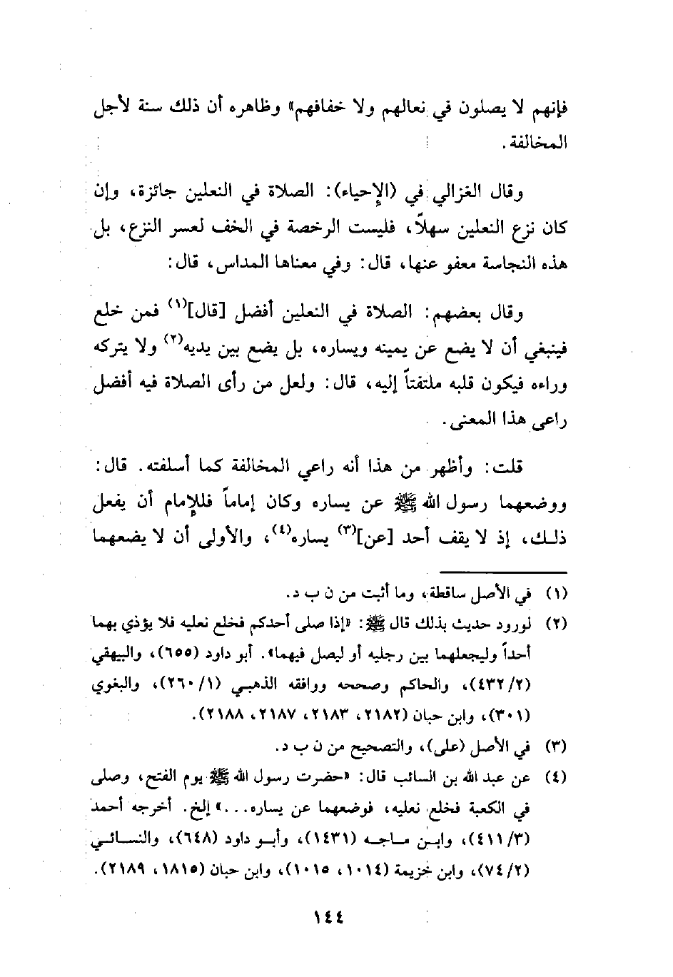 (¬4) عن عبد الله بن السائب قال: "حضرت رسول الله - صلى الله عليه وسلم - يوم الفتح، وصلى في الكعبة فخلع نعليه، فوضعهما عن يساره. ... " إلخ. أخرجه أحمد (3/ 411)، وابن ماجه (1431)، وأبو داود (648)، والنسائي (2/ 74)، وابن خزيمة (1014، 1015)، وابن حبان (1815، 2189).