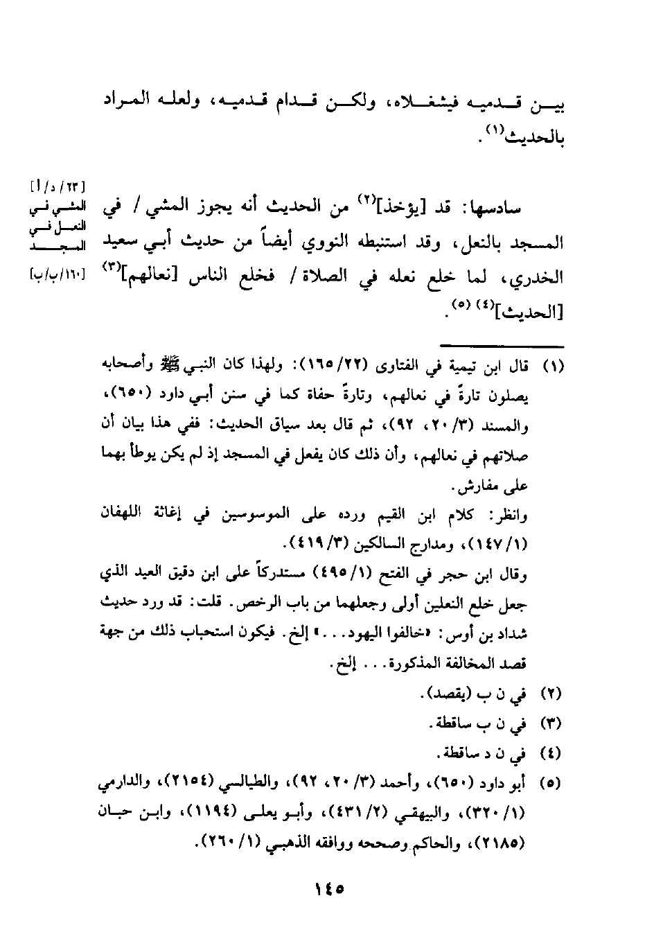 (¬1) قال ابن تيمية في الفتاوى (22/ 165): ولهذا كان النبي - صلى الله عليه وسلم - وأصحابه يصلون تارةً في نعالهم، وتارة حفاة كما في سنن أبي داود (650)، والمسند (3/ 20، 92)، ثم قال بعد سياق الحديث: ففي هذا بيان أن صلاتهم في نعالهم، وأن ذلك كان يفعل في المسجد إذ لم يكن يوطأ بهما على مفارش.