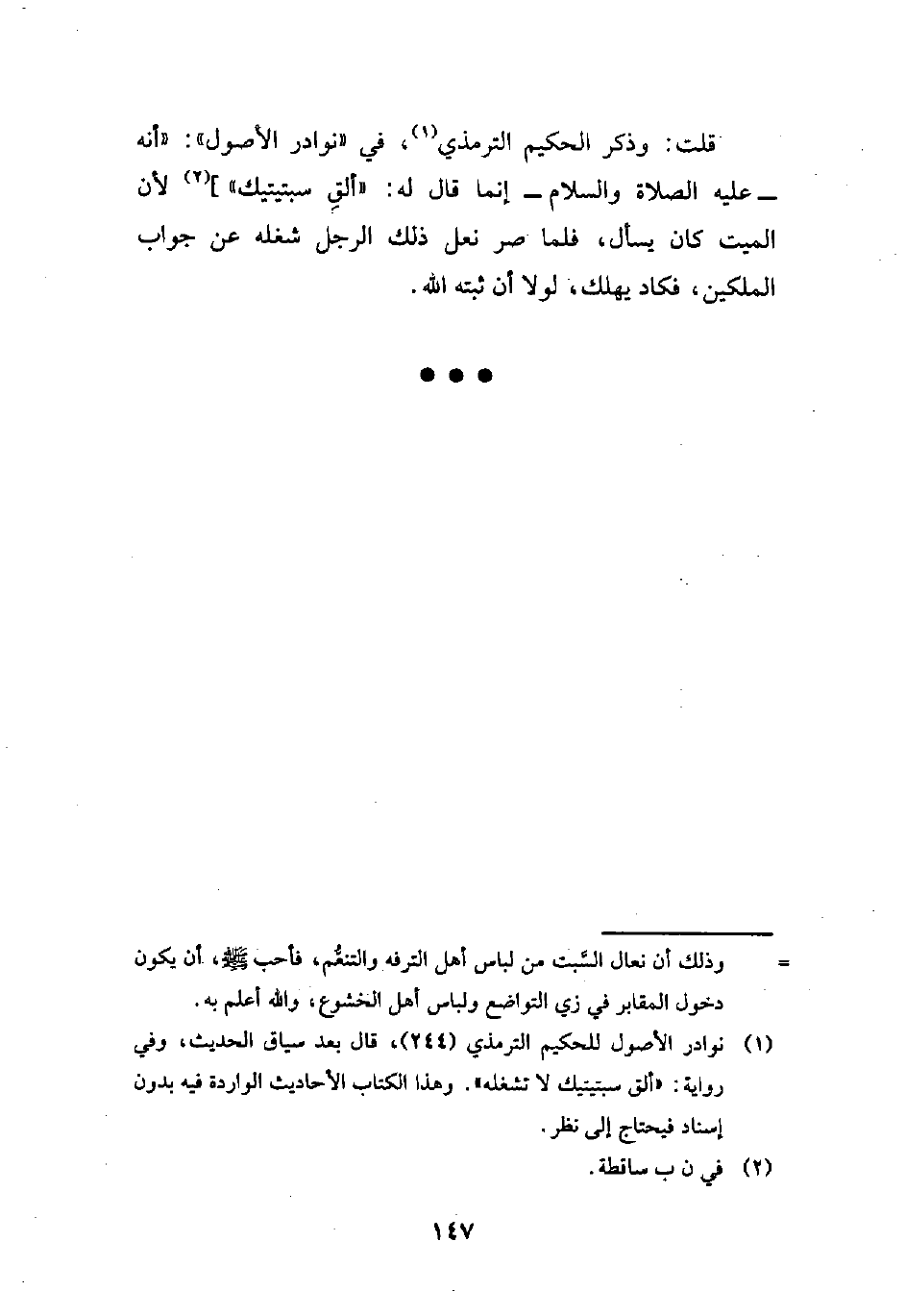 قلت: وذكر الحكيم الترمذي (¬1)، في "نوادر الأصول": "أنه - عليه الصلاة والسلام - إنما قال له: "ألقِ سبتيتيك"] (¬2) لأن الميت كان يسأل، فلما صر نعل ذلك الرجل شغله عن جواب الملكين، فكاد يهلك، لولا أن ثبته الله.
