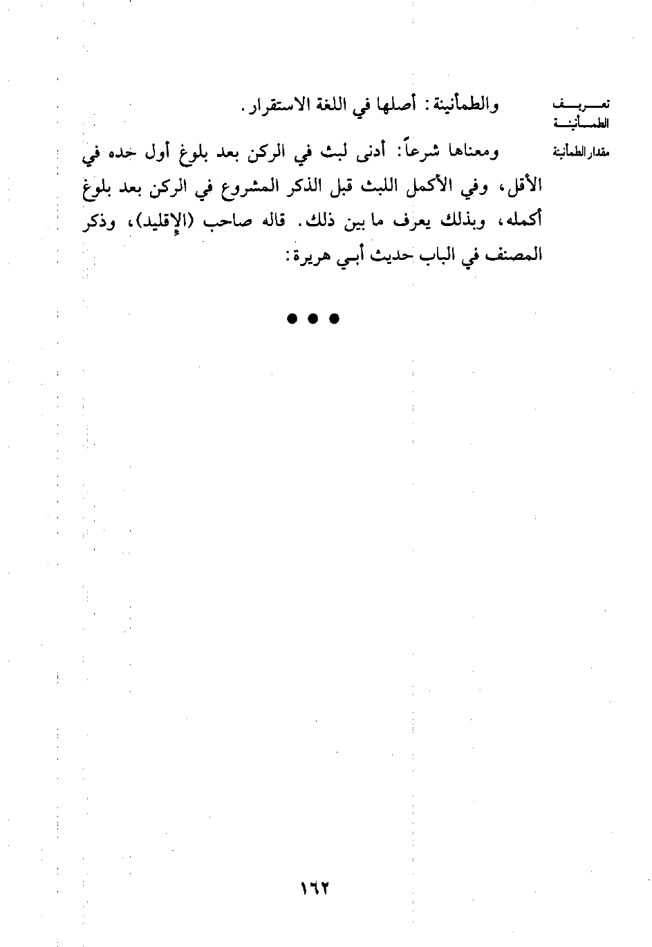ومعناها شرعًا: أدنى لبث في الركن بعد بلوغ أول حده في الأقل، وفي الأكمل اللبث قبل الذكر المشروع في الركن بعد بلوغ أكمله، وبذلك يعرف ما بين ذلك. قاله صاحب (الإِقليد)، وذكر المصنف في الباب حديث أبي هريرة: