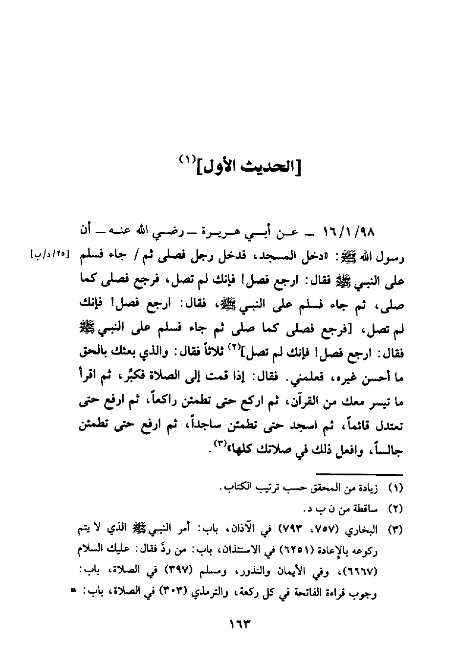 98/ 1/ 16 - عن أبي هريرة - رضي الله عنه - أن رسول الله - صلى الله عليه وسلم -: "دخل المسجد، فدخل رجل فصلى ثم جاء فسلم على النبي - صلى الله عليه وسلم - فقال: ارجع فصل! فإنك لم تصل، فرجع فصلى كما صلى، ثم جاء فسلم على النبي - صلى الله عليه وسلم -، فقال: ارجع فصل! فإنك لم تصل، [فرجع فصلى كما صلى ثم جاء فسلم على النبي - صلى الله عليه وسلم - فقال: ارجع فصل! فإنك لم تصل] (¬2) ثلاثًا فقال: والذي بعثك بالحق ما أحسن غيره، فعلمني. فقال: إذا قمت إلى الصلاة فكبِّر، ثم اقرأ ما تيسر معك من القرآن، ثم اركع حتى تطمئن راكعًا، ثم ارفع حتى تعتدل قائمًا، ثم اسجد حتى تطمئن ساجدًا، ثم ارفع حتى تطمئن جالسًا، وافعل ذلك في صلاتك كلها" (¬3).