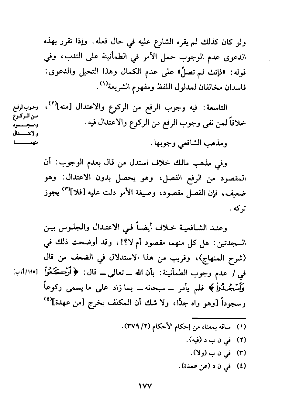 وفي مذهب مالك خلاف استدل من قال بعدم الوجوب: أن المقصود من الرفع الفصل، وهو يحصل بدون الاعتدال: وهو ضعيف، فإن الفصل مقصود، وصيغة الأمر دلت عليه [فلا] (¬3) يجوز تركه.