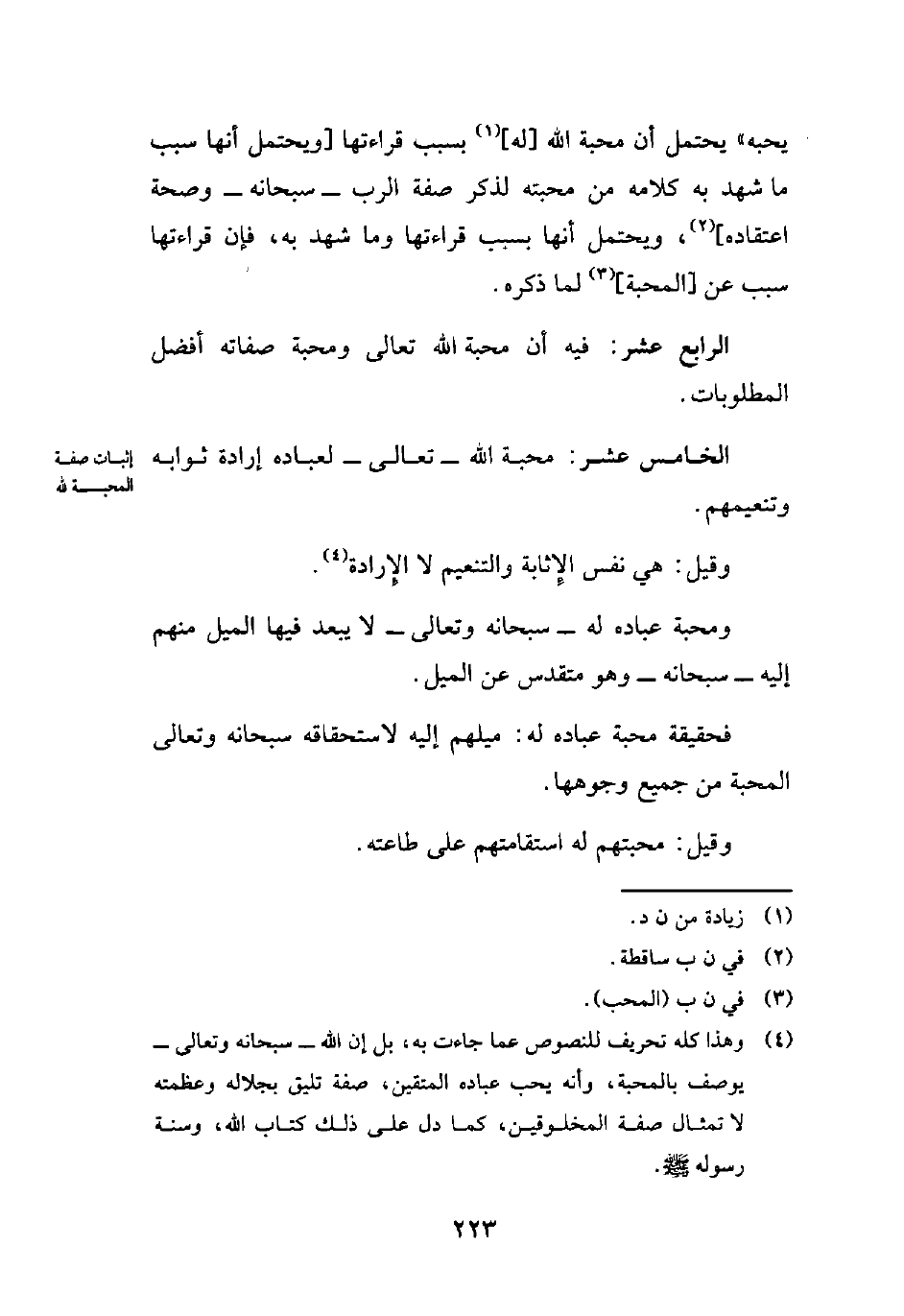 (¬4) وهذا كله تحريف للنصوص عما جاءت به، بل إن الله -سبحانه وتعالى- يوصف بالمحبة، وأنه يحب عباده المتقين، صفة تليق بجلاله وعظمته لا تمثال صفة المخلوقين، كما دل على ذلك كتاب الله، وسنة رسوله - صلى الله عليه وسلم -.