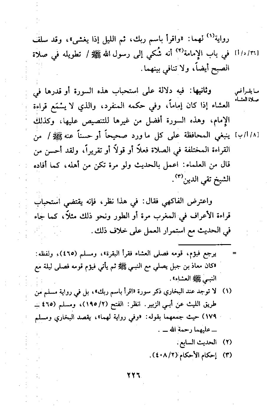 وثانيها: فيه دلالة على استحباب هذه السورة أو قدرها في العشاء إذا كان إمامًا، وفي حكمه المنفرد، والذي لا يسْمَع قراءةً الإِمام، وهذه السورة أفضل من غيرها للتنصيص عليها، وكذلك ينبغي المحافظة على كل ما ورد صحيحًا أو حسنًا عنه - صلى الله عليه وسلم - من القراءة المختلفة في الصلاة فعلًا أو قولًا أو تقريرًا، ولقد أحسن من قال من العلماء: اعمل بالحديث ولو مرة تكن من أهله، كما أفاده الشيخ تقي الدين (¬3).