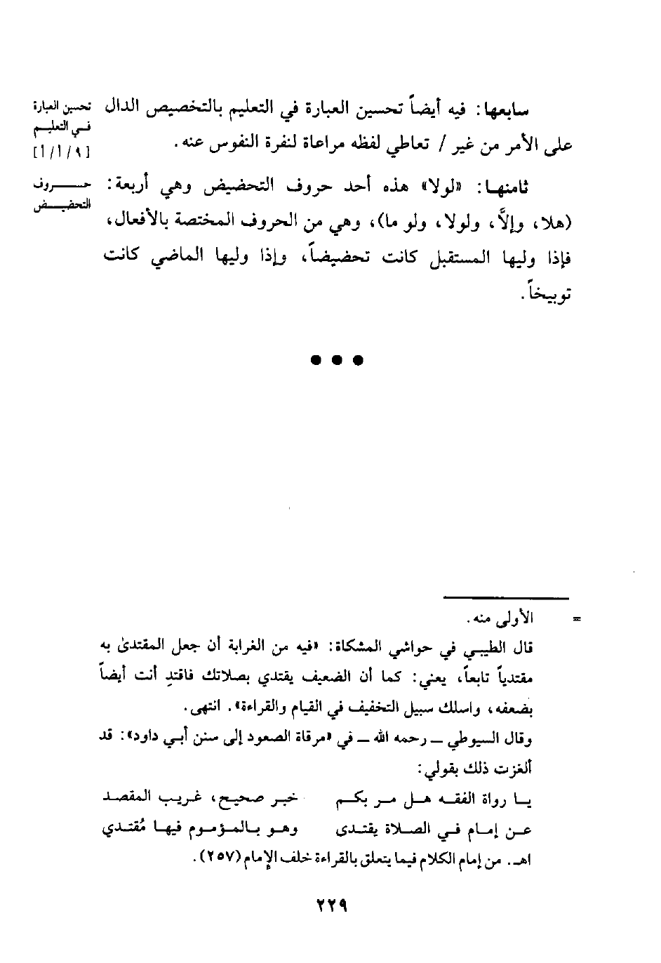 سابعها: فيه أيضًا تحسين العبارة في التعليم بالتخصيص الدال على الأمر من غير تعاطي لفظه مراعاة لنفرة النفوس عنه.