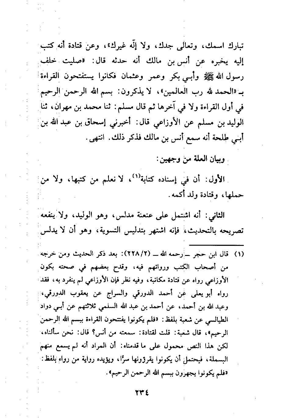 (¬1) قال ابن حجر -رحمه الله- (2/ 228): بعد ذكر الحديث ومن خرجه من أصحاب الكتب ورواتهم فيه، وقدح بعضهم في صحته بكون الأوزاعي رواه عن قتادة مكاتبة، وفيه نظر من الأوزاعي لم ينفرد به، فقد رواه أبو يعلى عن أحمد الدورقي والسراج عن يعقوب الدورقي، وعبد الله بن أحمد، عن أحمد بن عبد الله السلمي ثلاثتهم عن أبي دواد الطيالسي عن شعبة بلفظ: "فلم يكونوا يفتتحون القراءة ببسم الله الرحمن الرحيم"، قال شعبة: قلت لقتادة: سمعته من أنس؟ قال: نحن سألناه، لكن هذا النص محمول على ما قدمناه: أن المراد أنه لم يسمع منهم البسملة، فيحتمل أن يكونوا يقرؤونها سرًّا، ويؤيده رواية من رواه بلفظ: "فلم يكونوا يجهرون ببسم الله الرحمن الرحيم".