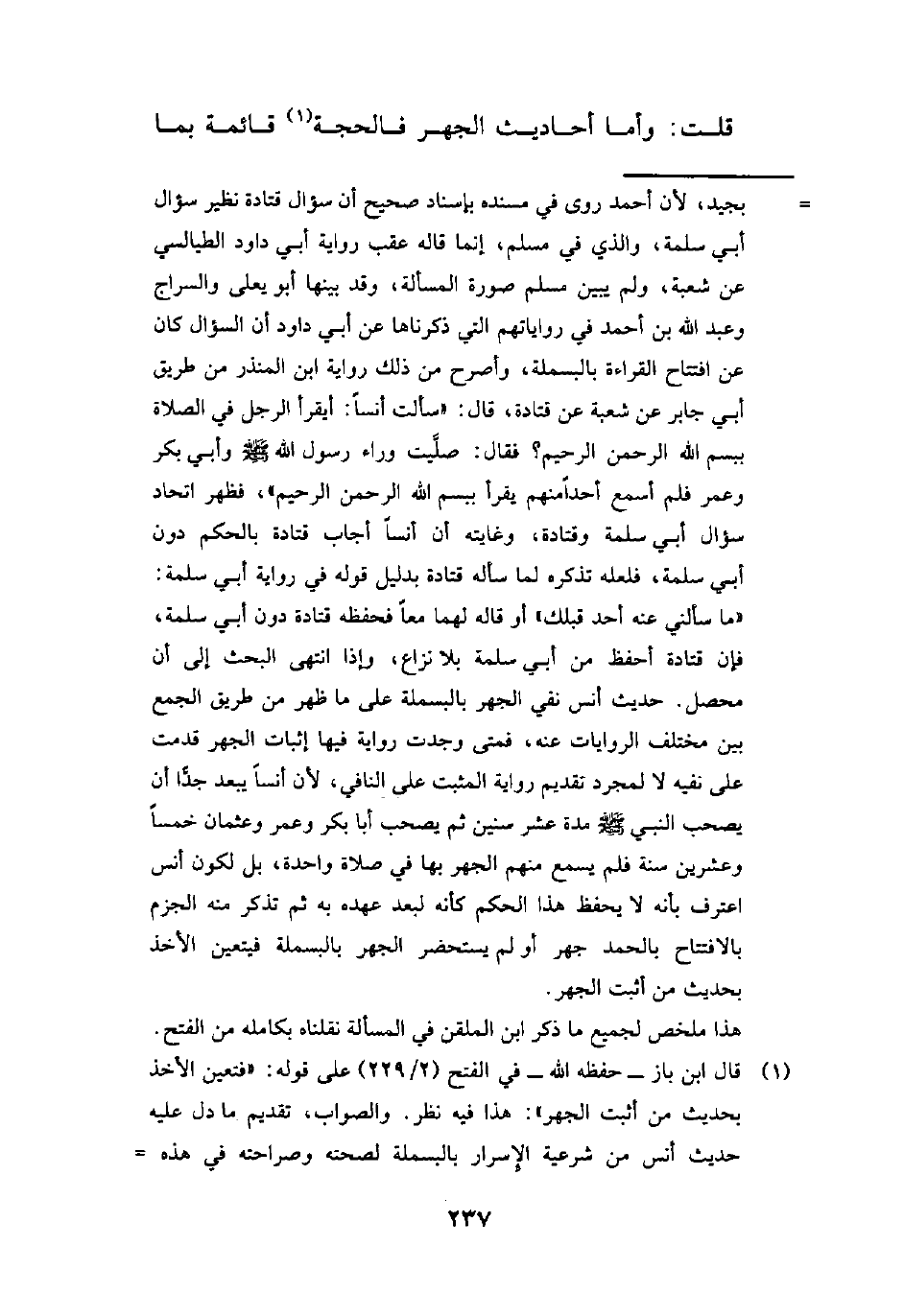 (¬1) قال ابن باز -حفظه الله- في الفتح (2/ 229) على قوله: "فتعين الأخذ بحديث من أثبت الجهر": هذا فيه نظر. والصواب، تقديم ما دل عليه حديث أنس من شرعية الإِسرار بالبسملة لصحته وصراحته في هذه =