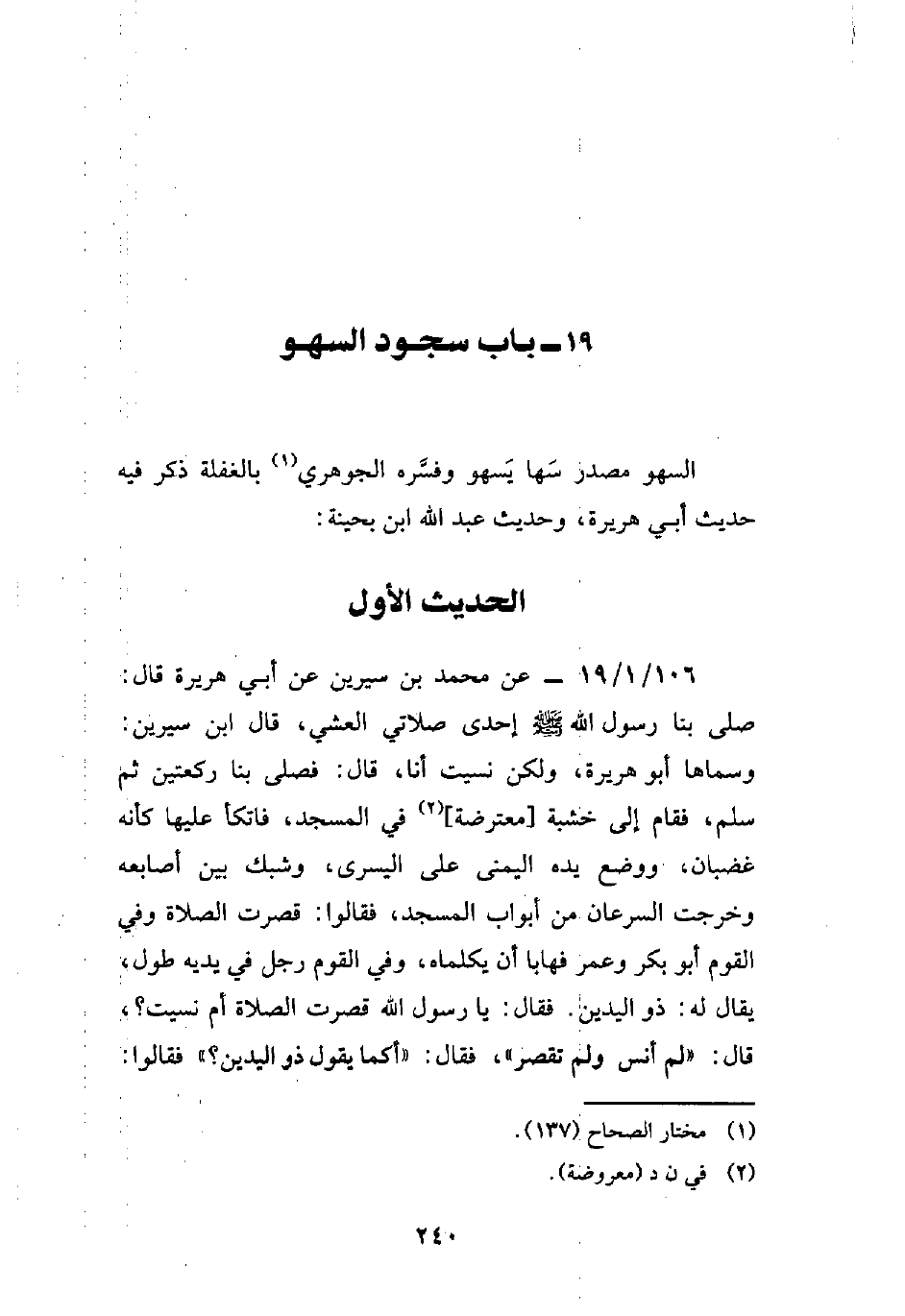 106/ 1/ 19 - عن محمد بن سيرين عن أبي هريرة قال: صلى بنا رسول الله - صلى الله عليه وسلم - إحدى صلاتي العشي، قال ابن سيرين: وسماها أبو هريرة، ولكن نسيت أنا، قال: فصلى بنا ركعتين ثم سلم، فقام إلى خشبة [معترضة] (¬2) في المسجد، فاتكأ عليها كأنه غضبان، ووضع يده اليمنى على اليسرى، وشبك بين أصابعه وخرجت السرعان من أبواب المسجد، فقالوا: قصرت الصلاة وفي القوم أبو بكر وعمر فهابا أن يكلماه، وفي القوم رجل في يديه طول، يقال له: ذو اليدين. فقال: يا رسول الله قصرت الصلاة أم نسيت؟، قال: "لم أنس ولم تقصر"، فقال: "أكما يقول ذو اليدين؟ " فقالوا: