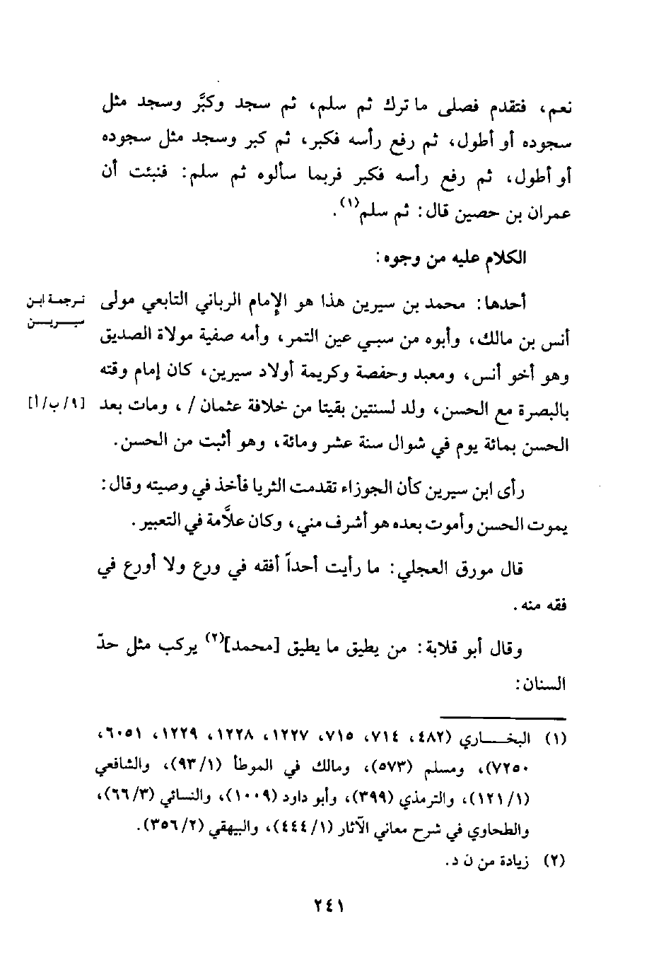 (¬1) البخاري (482، 714، 715، 1227، 1228، 1229، 6051، 7250)، ومسلم (573)، ومالك في الموطأ (1/ 93)، والشافعي (1/ 121)، والترمذي (399)، وأبو داود (1009)، والنسائي (3/ 66)، والطحاوي في شرح معاني الآثار (1/ 444)، والبيهقي (2/ 356).