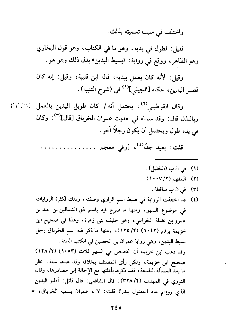 (¬4) قد اختلفت الرواية في ضبط اسم الراوي وصفته، وذلك لكثرة الروايات في موضوع السهو، ومنها ما صرح فيه باسم ذي الشمالين بن عبد بن عمرو بن نضلة الخزاعي، وهو حليف بني زهرة، وهذا في صحيح ابن خزيمة برقم (1042) (2/ 125)، ومنها ما ذكر فيه اسم الخرباق رجل بسيط اليدين، وهي رواية عمران بن الحصين في الكتب الستة.