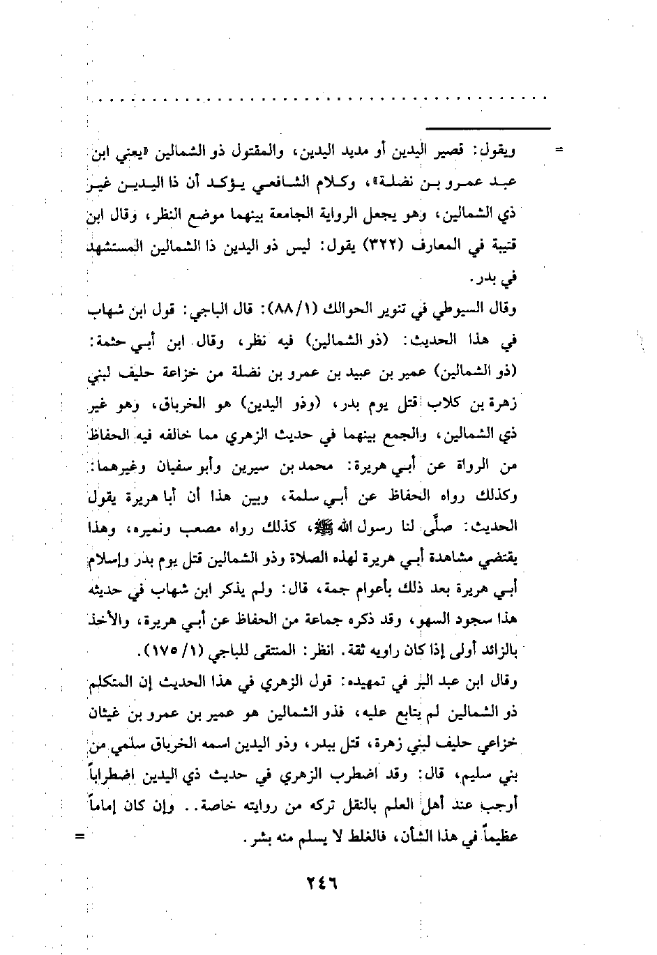 وقال السيوطي في تنوير الحوالك (1/ 88): قال الباجي: قول ابن شهاب في هذا الحديث: (ذو الشمالين) فيه نظر، وقال ابن أبي حثمة: (ذو الشمالين) عمير بن عبيد بن عمرو بن نضلة من خزاعة حليف لبني زهرة بن كلاب قتل يوم بدر، (وذو الدين) هو الخرباق، وهو غير ذي الشمالين، والجمع بينهما في حديث الزهري مما خالفه فيه الحفاظ من الرواة عن أبي هريرة: محمد بن سيرين وأبو سفيان وغيرهما: وكذلك رواه الحفاظ عن أبي سلمة، وبين هذا أن أبا هريرة يقول الحديث: صلى لنا رسول الله - صلى الله عليه وسلم -، كذلك رواه مصعب ونميره، وهذا يقتضي مشاهدة أبي هريرة لهذه الصلاة وذو الشمالين قتل يوم بدر وإسلام أبي هريرة بعد ذلك بأعوام جمة، قال: ولم يذكر ابن شهاب في حديثه هذا سجود السهو، وقد ذكره جماعة من الحفاظ عن أبي هريرة، والأخذ بالزائد أولى إذا كان راويه ثقة. انظر: المنتقى للباجي (1/ 175).