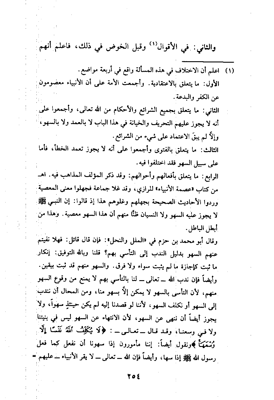الرابع: ما يتعلق بأفعالهم وأحوالهم: وقد ذكر المؤلف المذاهب فيه. اهـ من كتاب "عصمة الأنبياء" للرازي، وقد غلا جماعة فجهلوا معنى المعصية وردوا الأحاديث الصحيحة بجهلهم وغلوهم هذا إذ قالوا: إن النبي - صلى الله عليه وسلم - لا يجوز عليه السهو ولا النسيان ظنًّا منهم أن هذا السهو معصية. وهذا من أبطل الباطل.