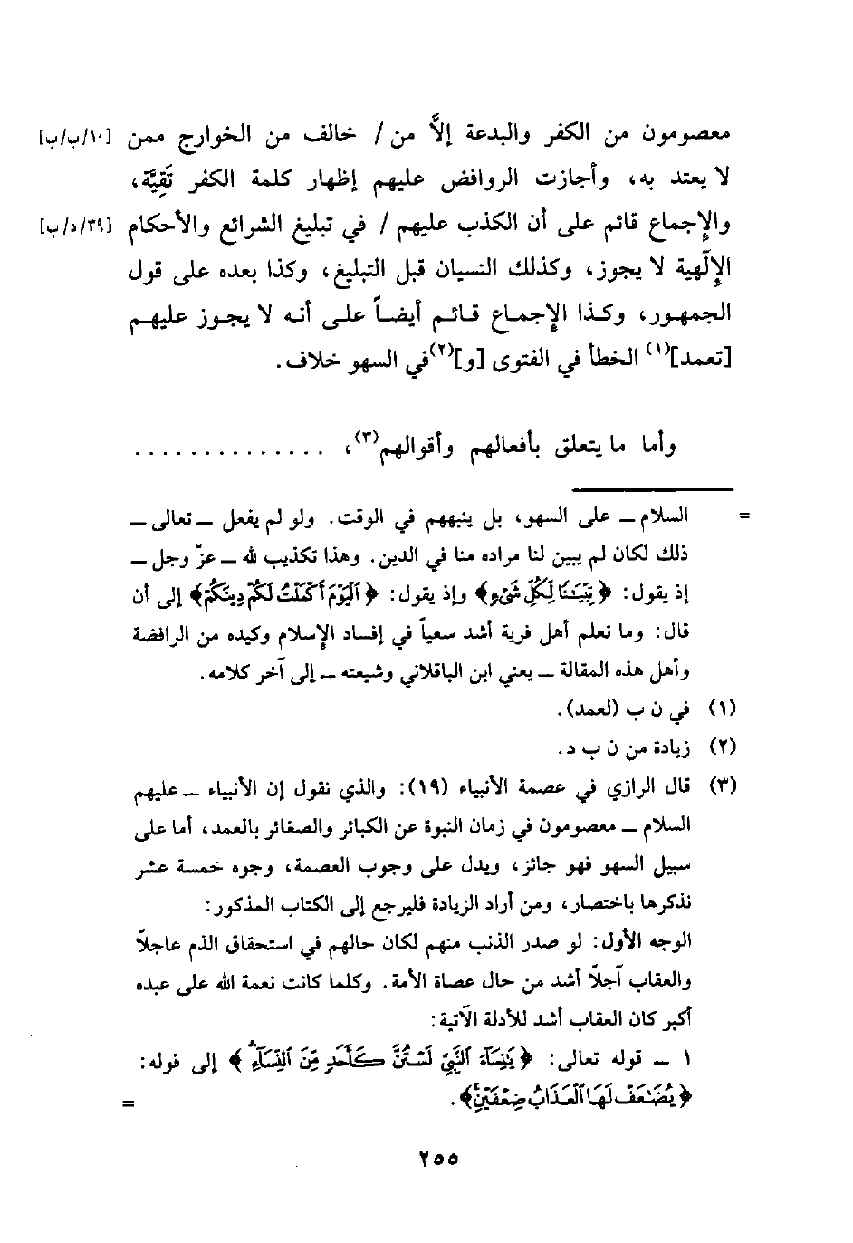 (¬3) قال الرازي في عصمة الأنبياء (19): والذي نقول إن الأنبياء - عليهم السلام - معصومون في زمان النبوة عن الكبائر والصغائر بالعمد، أما على سبيل السهو فهو جائز، ويدل على وجوب العصمة، وجوه خمسة عشر نذكرها باختصار، ومن أراد الزيادة فليرجع إلى الكتاب المذكور: