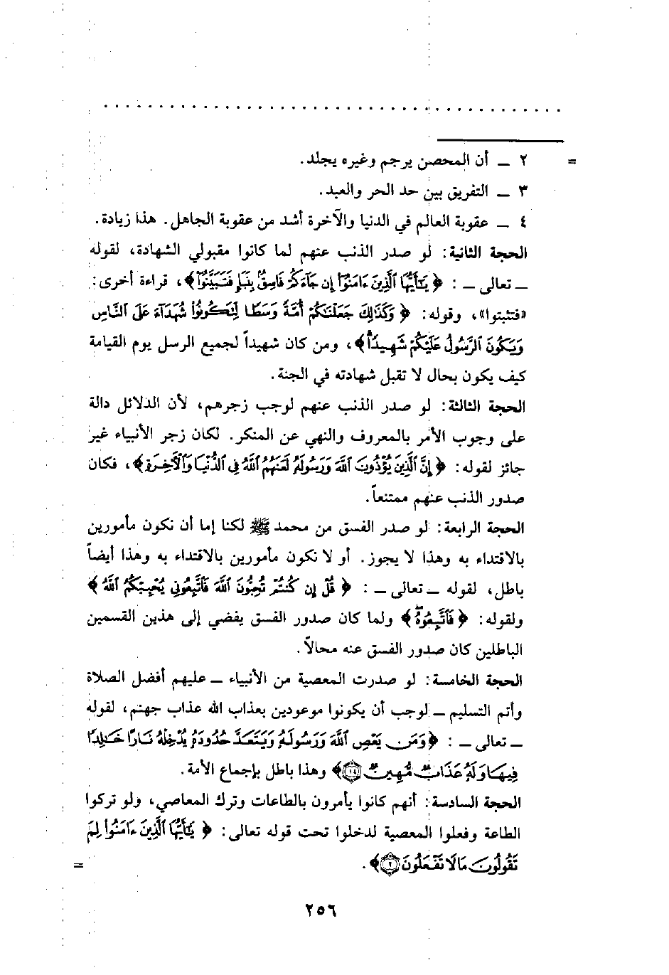 الحجة الرابعة: لو صدر الفسق من محمد - صلى الله عليه وسلم - لكنا إما أن نكون مأمورين بالاقتداء به وهذا لا يجوز. أو لا نكون مأمورين بالاقتداء به وهذا أيضًا باطل، لقوله -تعالى-: {قُلْ إِنْ كُنْتُمْ تُحِبُّونَ اللَّهَ فَاتَّبِعُونِي يُحْبِبْكُمُ اللَّهُ} ولقوله: {فَاتَّبِعُوهُ} ولما كان صدور الفسق يفضي إلى هذين القسمين الباطلين وإن صدور الفسق عنه محالًا.