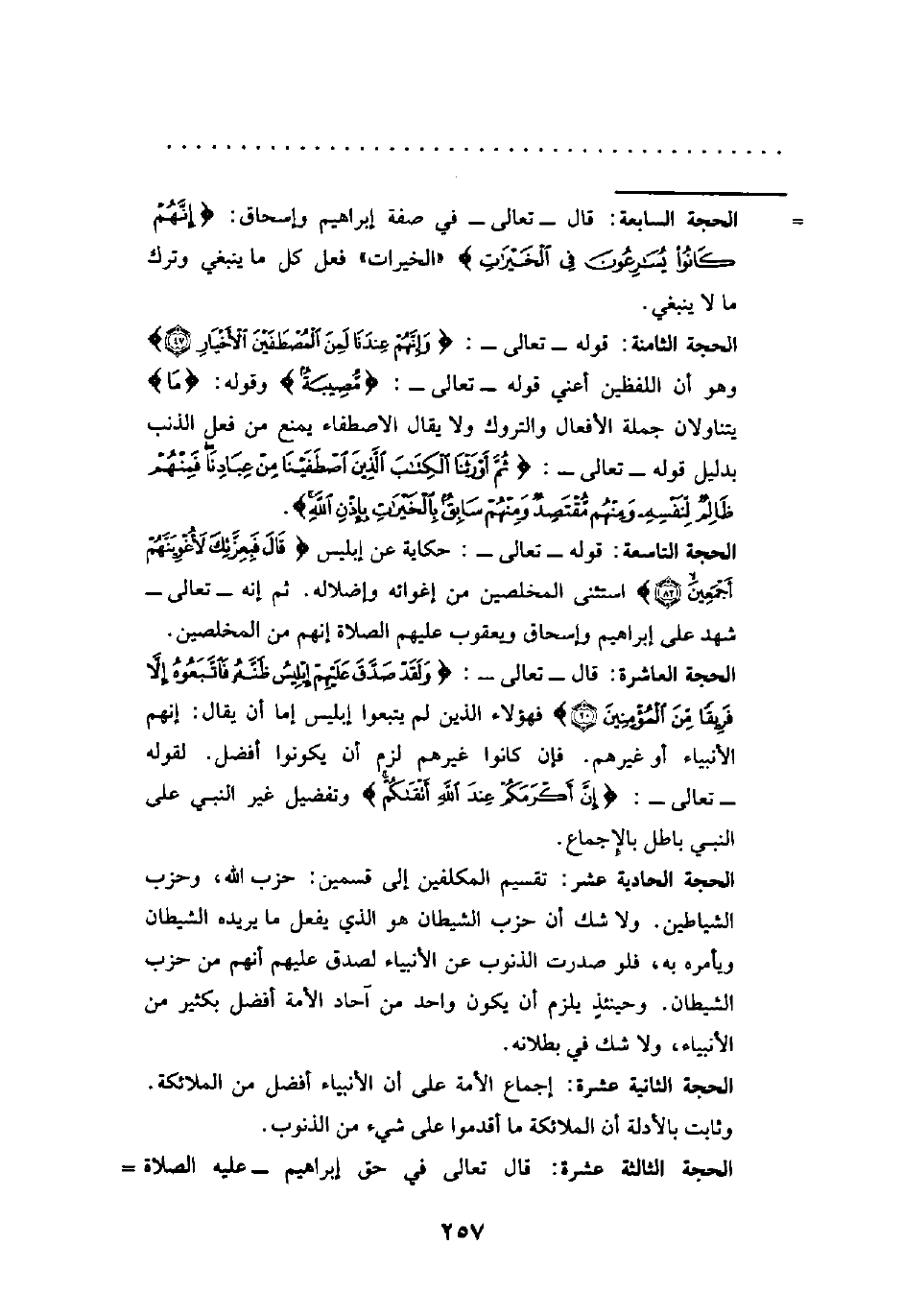 الحجة التاسعة: قوله -تعالى-: حكايته عن إبليس {قَالَ فَبِعِزَّتِكَ لَأُغْوِيَنَّهُمْ أَجْمَعِينَ (82)} استثنى المخلصين من إغوائه وإضلاله. ثم إنه -تعالى- شهد على إبراهيم وإسحاق ويعقوب عليهم الصلاة إنهم من المخلصين.
