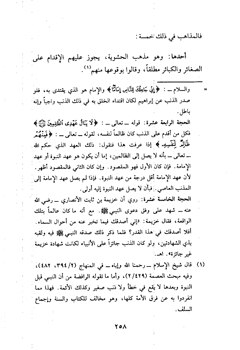 (¬1) قال شيخ الإِسلام -رحمنا الله وإياه- في المنهاج (2/ 394، 482)، وفيه مبحث العصمة (429/ 2)، وأما ما تقوله الرافضة من أن النبي قبل النبوة وبعدها لا يقع في خطأ ولا ذنب صغير وكذلك الأئمة. فهذا مما انفردوا به عن فرق الأمة كلها، وهو مخالف للكتاب والسنة وإجماع السلف.