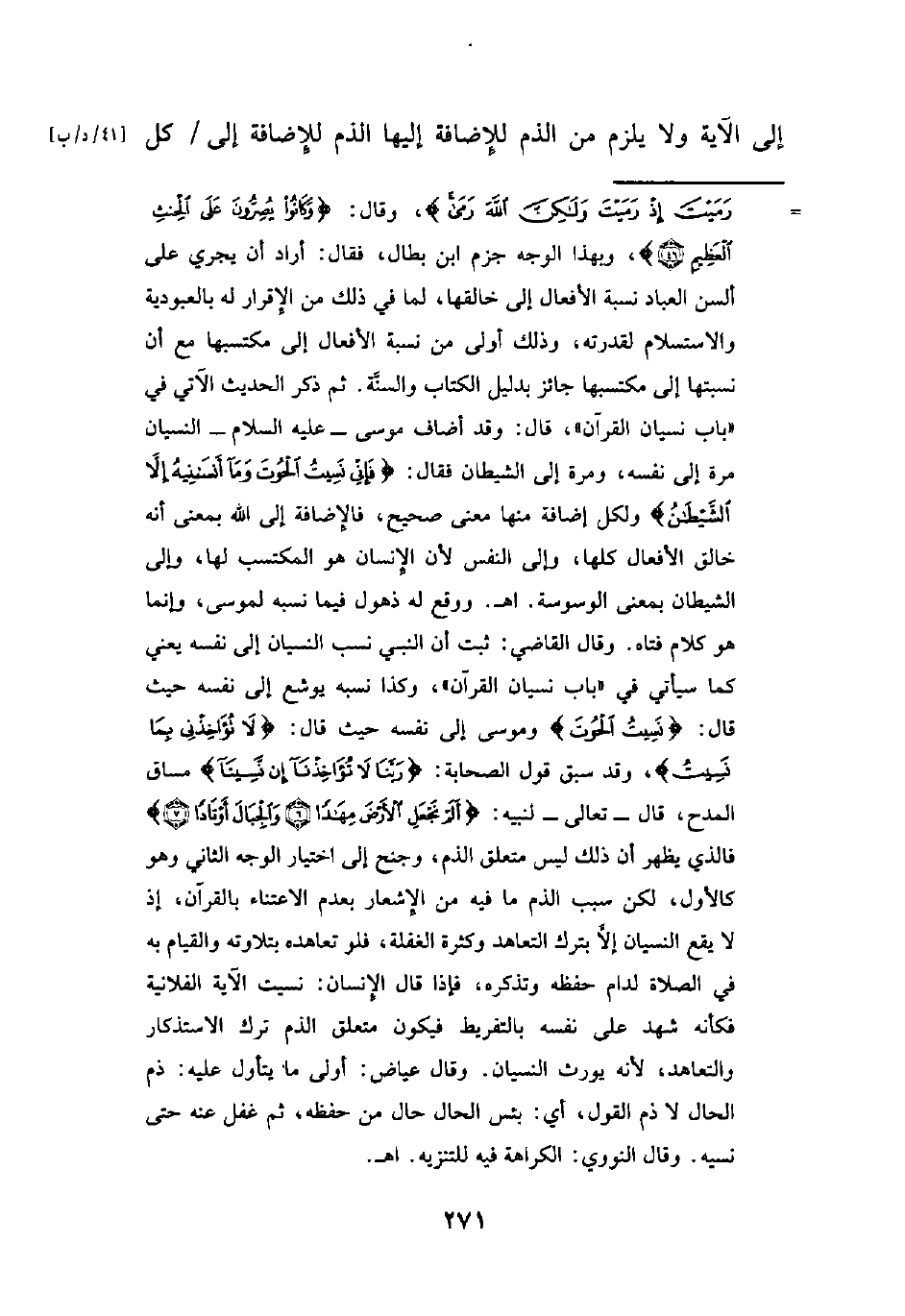 = رَمَيْتَ إِذْ رَمَيْتَ وَلَكِنَّ اللَّهَ رَمَى}، وقال: {وَكَانُوا يُصِرُّونَ عَلَى الْحِنْثِ الْعَظِيمِ (46)}، وبهذا الوجه جزم ابن بطال، فقال: أراد أن يجري على ألسن العباد نسبة الأفعال إلى خالقها، لما في ذلك من الإِقرار له بالعبودية والاستسلام لقدرته، وذلك أولى من نسبة الأفعال إلى مكتسبها مع أن نسبتها إلى مكتسبها جائز بدليل الكتاب والسنَّة. ثم ذكر الحديث الآتي في "باب نسيان القرآن"، قال: وقد أضاف موسى - عليه السلام- النسيان مرة إلى نفسه، ومرة إلى الشيطان فقال: {فَإِنِّي نَسِيتُ الْحُوتَ وَمَا أَنْسَانِيهُ إِلَّا الشَّيْطَانُ} ولكل إضافة منها معنى صحيح، فالإِضافة إلى الله بمعنى أنه خالق الأفعال كلها، وإلى النفس لأن الإِنسان هو المكتسب لها، وإلى الشيطان بمعنى الوسوسة. اهـ. ووقع له ذهول فيما نسبه لموسى، وإنما هو كلام فتاه. وقال القاضي: ثبت أن النبي نسب النسيان إلى نفسه يعني كما سيأتي في "باب نسيان القرآن"، وكذا نسبه يوشع إلى نفسه حيث قال: {نَسِيتُ الْحُوتَ} وموسى إلى نفه حيث قال: {لَا تُؤَاخِذْنِي بِمَا نَسِيتُ}، وقد سبق قول الصحابة: {رَبَّنَا لَا تُؤَاخِذْنَا إِنْ نَسِينَا} مساق المدح، قال -تعالى- لنبيه: {أَلَمْ نَجْعَلِ الْأَرْضَ مِهَادًا (6) وَالْجِبَالَ أَوْتَادًا (7)} فالذي بظهر أن ذلك ليس متعلق الذم، وجنح إلى اختيار الوجه الثاني وهو كالأول، لكن سبب الذم ما فيه من الإِشعار بعدم الاعتناء بالقرآن، إذ لا يقع النسيان إلَّا بترك التعاهد وكثرة الغفلة، فلو تعاهده بتلاوته والقيام به في الصلاة لدام حفظه وتذكره، فإذا قال الإِنسان: نسيت الآية الفلانية فكأنه شهد على نفسه بالتفريط فيكون متعلق الذم ترك الاستذكار والتعاهد، لأنه يورث النسيان. وقال عياض: أولى ما يتأول عليه: ذم الحال لا ذم القول، أي: بئس الحال حال من حفظه، ثم غفل عنه حتى نسيه. وقال النووي: الكراهة فيه للتنزيه. اهـ.