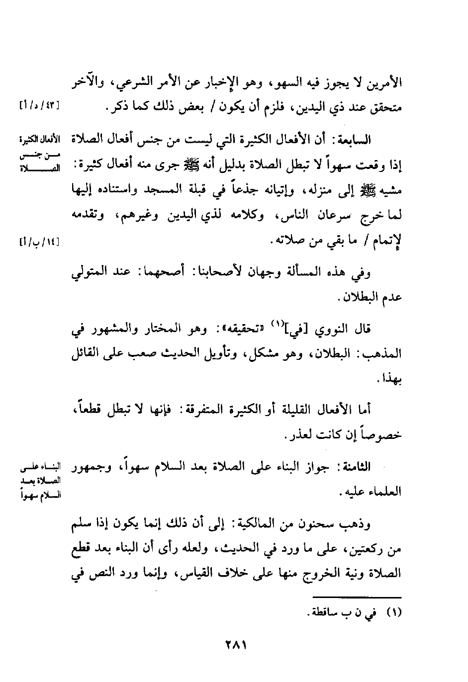 السابعة: أن الأفعال الكثيرة التي ليست من جنس أفعال الصلاة إذا وقعت سهوًا لا تبطل الصلاة بدليل أنه - صلى الله عليه وسلم - جرى منه أفعال كثيرة: مشيه - صلى الله عليه وسلم - إلى منزله، وإتيانه جذعًا في قبلة المسجد واستناده إليها لما خرج سرعان الناس، وكلامه لذي اليدين وغيرهم، وتقدمه لإِتمام ما بقي من صلاته.