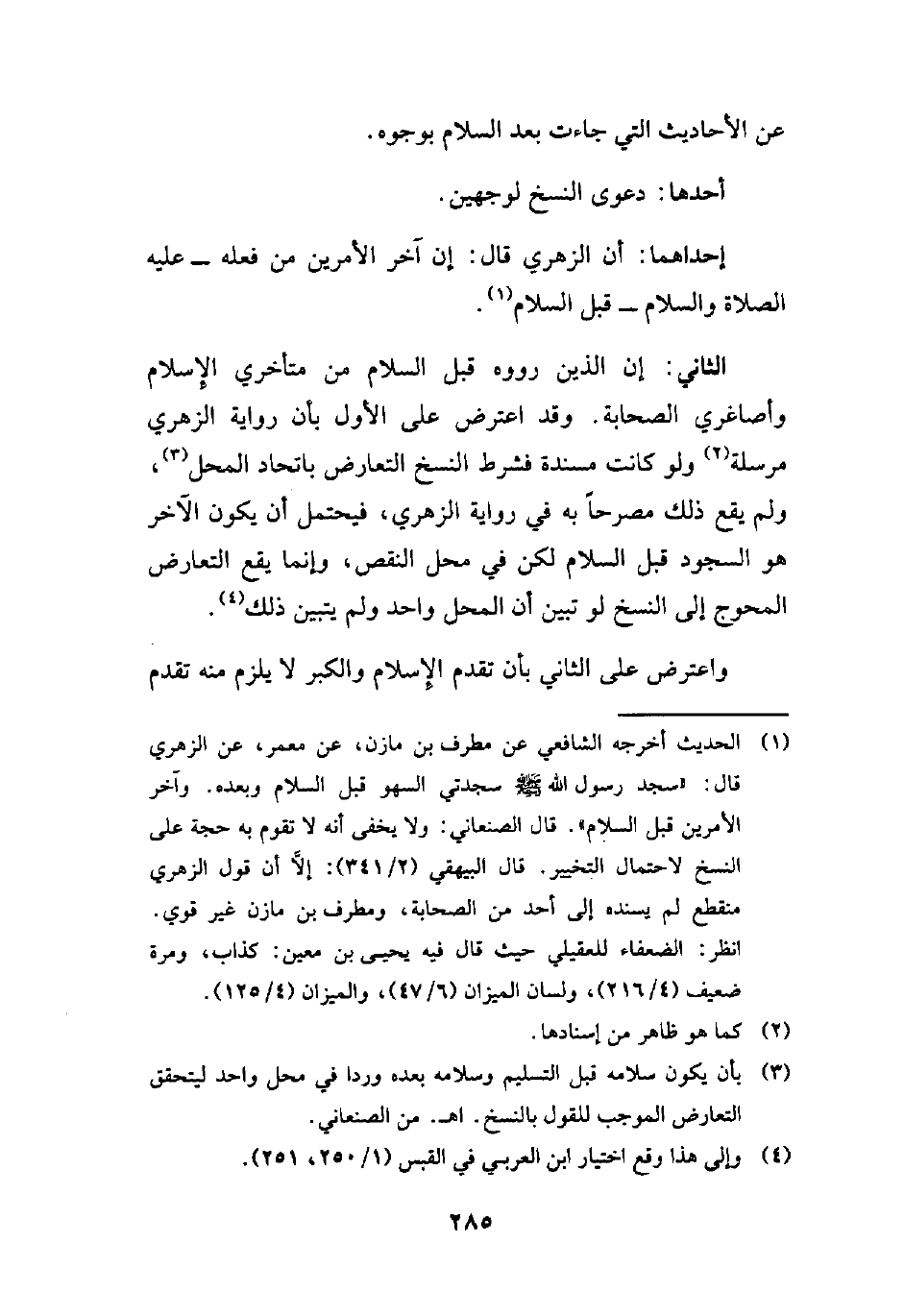 الثاني: إن الذين رووه قبل السلام من متأخري الإِسلام وأصاغري الصحابة. وقد اعترض على الأول بأن رواية الزهري مرسلة (¬2) ولو كانت مسندة فشرط النسخ التعارض باتحاد المحل (¬3)، ولم يقع ذلك مصرحًا به في رواية الزهري، فيحتمل أن يكون الآخر هو السجود قبل السلام لكن في محل النقص، وإنما يقع التعارض المحوج إلى النسخ لو تبين أن المحل واحد ولم يتبين ذلك (¬4).