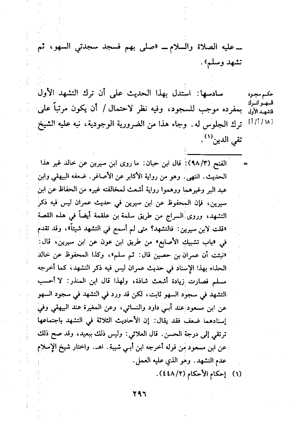= الفتح (3/ 98): قال ابن حبان: ما روى ابن سيرين عن خالد غير هذا الحديث. انتهى. وهو من رواية الأكابر عن الأصاغر. ضعفه البيهقي وابن عبد البر وغيرهما ووهموا رواية أشعث لمخالفته غيره من الحفاظ عن ابن سيرين، فإن المحفوظ عن ابن سيرين في حديث عمران ليس فيه ذكر التشهد، وروى السراج من طريق سلمة بن علقمة أيضًا في هذه القصة "قلت لابن سيرين: فالتشهد؟ متى لم أسمع في التشهد شيئًا"، وقد تقدم في "باب تشبيك الأصابع" من طريق ابن عون عن ابن سيرين، قال: "نبئت ان عمران بن حصين قال: ثم سلم"، وكذا المحفوظ عن خالد الحذاء بهذا الإِسناد في حديث عمران ليس فيه ذكر التشهد، كما أخرجه مسلم فصارت زيادة أشعث شاذة، ولهذا قال ابن المنذر: لا أحب التشهد في سجود السهو ثابت، لكن قد ورد في التشهد في سجود السهو عن ابن مسعود عند أبي داود والنسائي، وعن المغيرة عند البيهقي وفي إسنادهما ضعف فقد يقال: إن الأحاديث الثلاثة في التشهد باجتماعها ترتقي إلى درجة الحسن. قال العلائي: وليس ذلك ببعيد، وقد صح ذلك عن ابن مسعود من قوله أخرجه ابن أبي شيبة. اهـ. واختار شيخ الإِسلام عدم التشهد. وهو الذي عليه العمل.