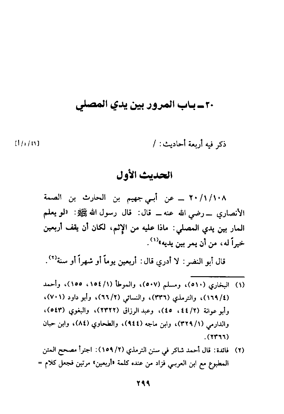 108/ 1/ 20 - عن أبي جهيم بن الحارث بن الصمة الأنصاري - رضي الله عنه - قال: قال رسول الله - صلى الله عليه وسلم -: "لو يعلم المار بين يدي المصلي. ماذا عليه من الإِثم، لكان أن يقف أربعين خيرًا له، من أن يمر بين يديه" (¬1).