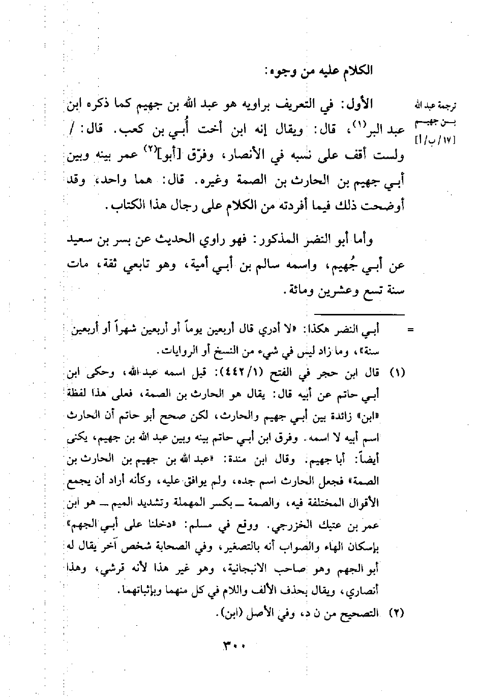 (¬1) قال ابن حجر في الفتح (1/ 442): قيل اسمه عبد الله، وحكى ابن أبي حاتم عن أبيه قال: يقال هو الحارث بن الصمة، فعلى هذا لفظة "ابن" زائدة بين أبي جهيم والحارث، لكن صحيح أبو حاتم أن الحارث اسم أبيه لا اسمه. وفرق ابن أبي حاتم بينه وبين عبد الله بن جهيم، يكنى أيضًا: أبا جهيم. وقال ابن مندة: "عبد الله بن جهيم بن الحارث بن الصمة" فجعل الحارث اسم جده، ولم يوافق عليه، وكأنه أراد أن يجمع الأقوال المختلفة فيه، والصمة -بكسر المهملة وتشديد الميم- هو ابن عمر بن عتيك الخزرجي. ووقع في مسلم: "دخلنا على أبي الجهم" بإسكان الهاء والصواب أنه بالتصغير، وفي الصحابة شخص آخر يقال له أبو الجهم وهو صاحب الانبجانية، وهو غير هذا لأنه قرشي، وهذا أنصاري، ويقال بحذف الألف واللام في كل منهما وبإثباتهما.