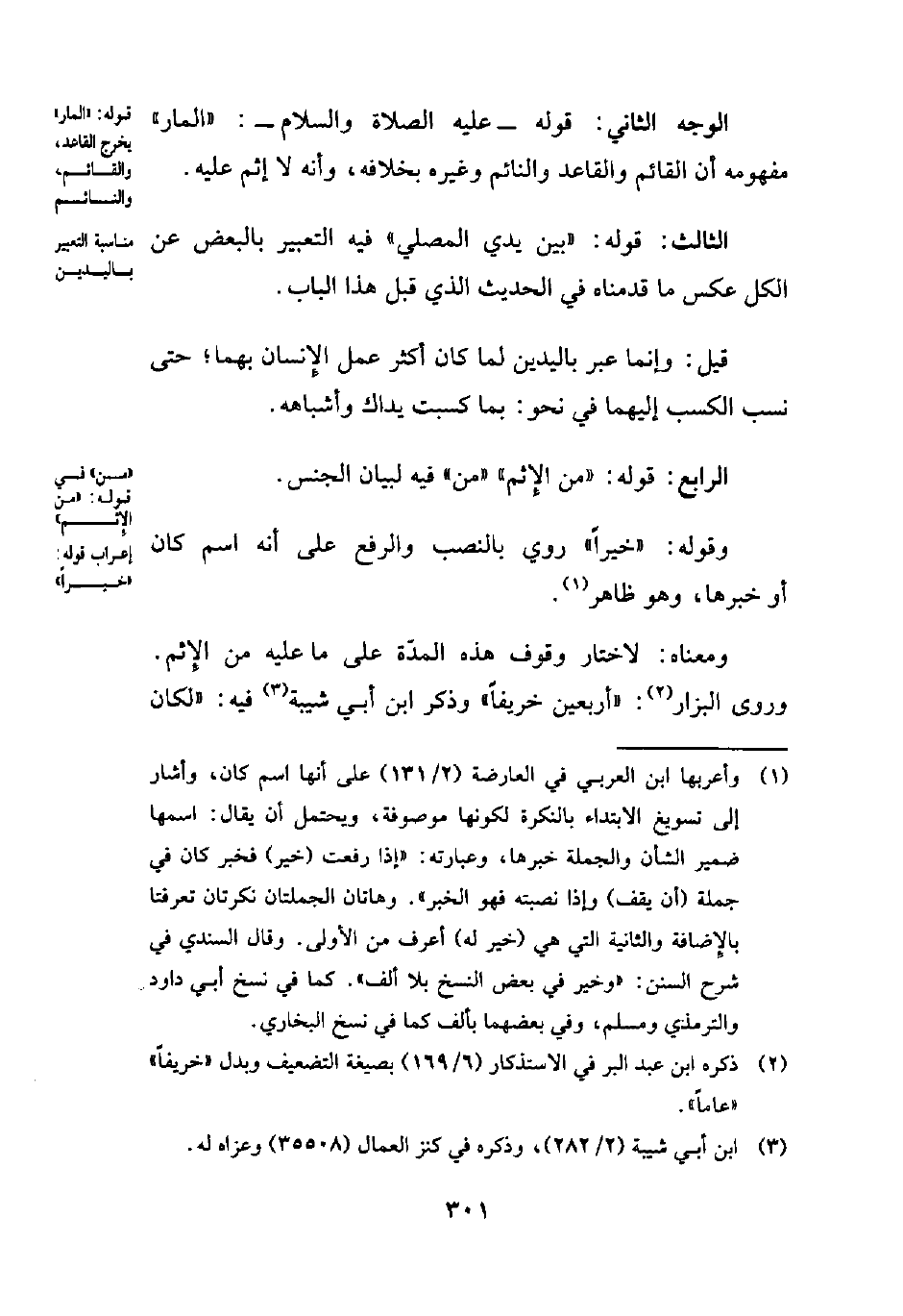 (¬1) وأعربها ابن العربي في العارضة (2/ 131) على أنها اسم كان، وأشار إلى تسويغ الابتداء بالنكرة لكونها موصوفة، ويحتمل أن يقال: اسمها ضمير الشأن والجملة خبرها، وعبارته: "إذا رفعت (خير) فخبر كان في جملة (أن يقف) وإذا نصبة فهو الخبر". وهاتان الجملتان نكرتان تعرفتا بالإِضافة والثانية التي هي (خير له) أعرف من الأولى. وقال السندي في شرح السنن: "وخير في بعض النسخ بلا ألف". كما في نسخ أبي داود والترمذي ومسلم، وفي بعضهما بألف كما في نسخ البخاري.