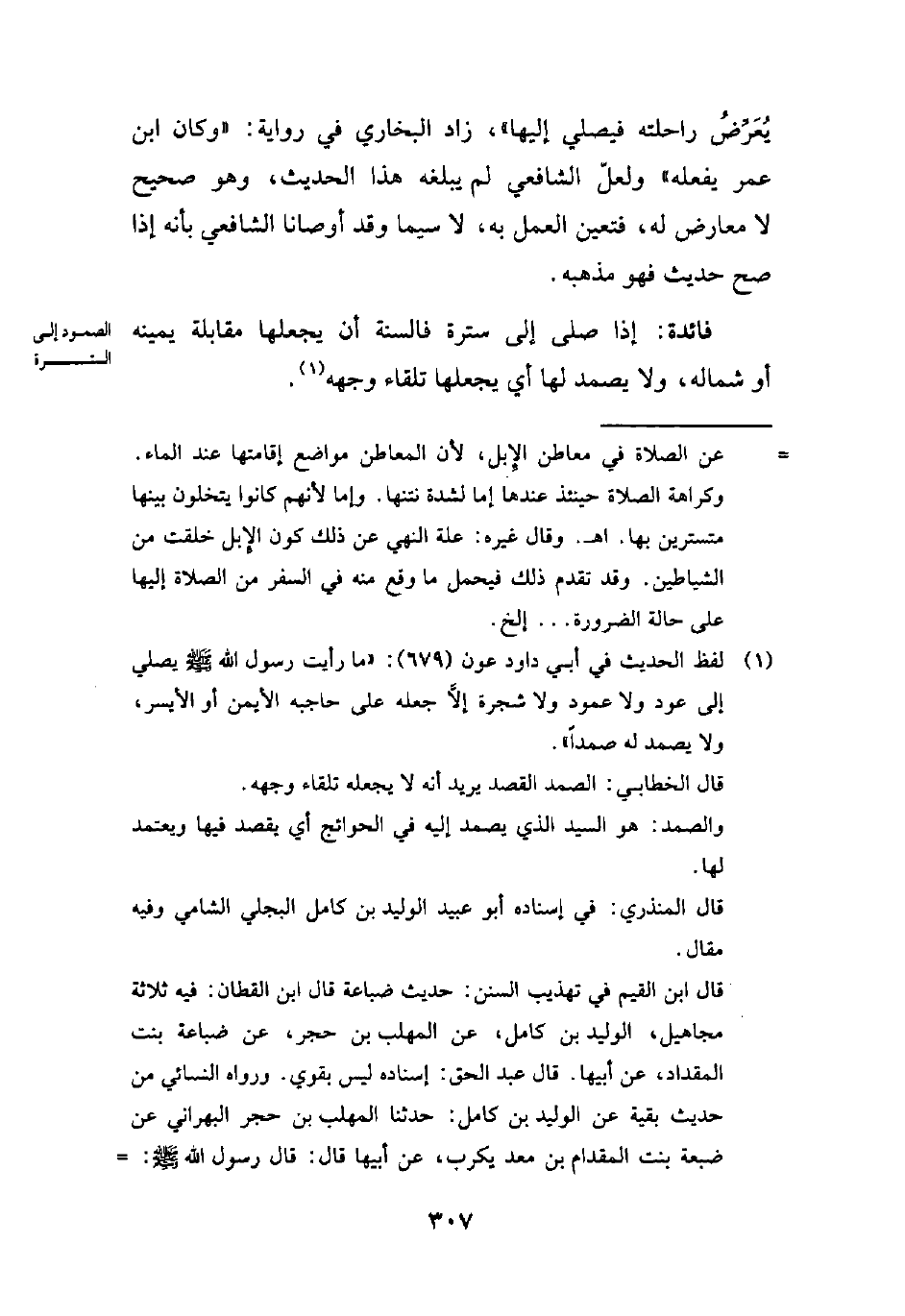 (¬1) لفظ الحديث في أبي داود عون (679): "ما رأيت رسول الله - صلى الله عليه وسلم - يصلي إلى عود ولا عمود ولا شجرة إلَّا جعله على حاجبه الأيمن أو الأيسر، ولا يصمد له صمدًا".