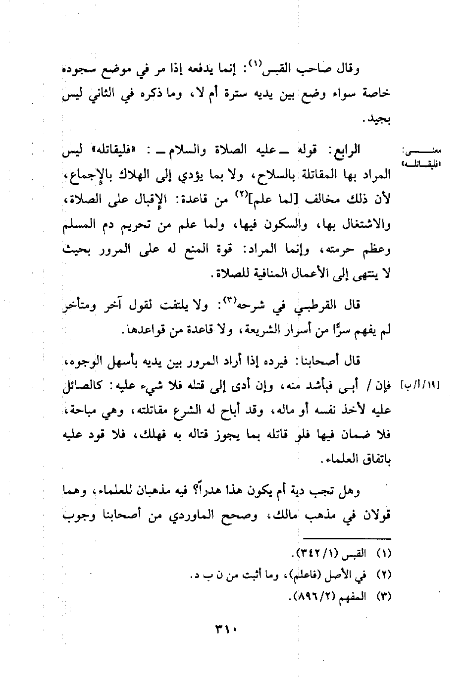 الرابع: قوله - عليه الصلاة والسلام -: "فليقاتله" ليس المراد بها المقاتلة بالسلاح، ولا بما يؤدي إلى الهلاك بالإِجماع، لأن ذلك مخالف [لما علم] (¬2) من قاعدة: الإِقبال على الصلاة، والاشتغال بها، والسكون فيها، ولما علم من تحريم دم المسلم وعظم حرمته، وإنما المراد: قوة المنع له على المرور بحيث لا ينتهى إلى الأعمال المنافية للصلاة.