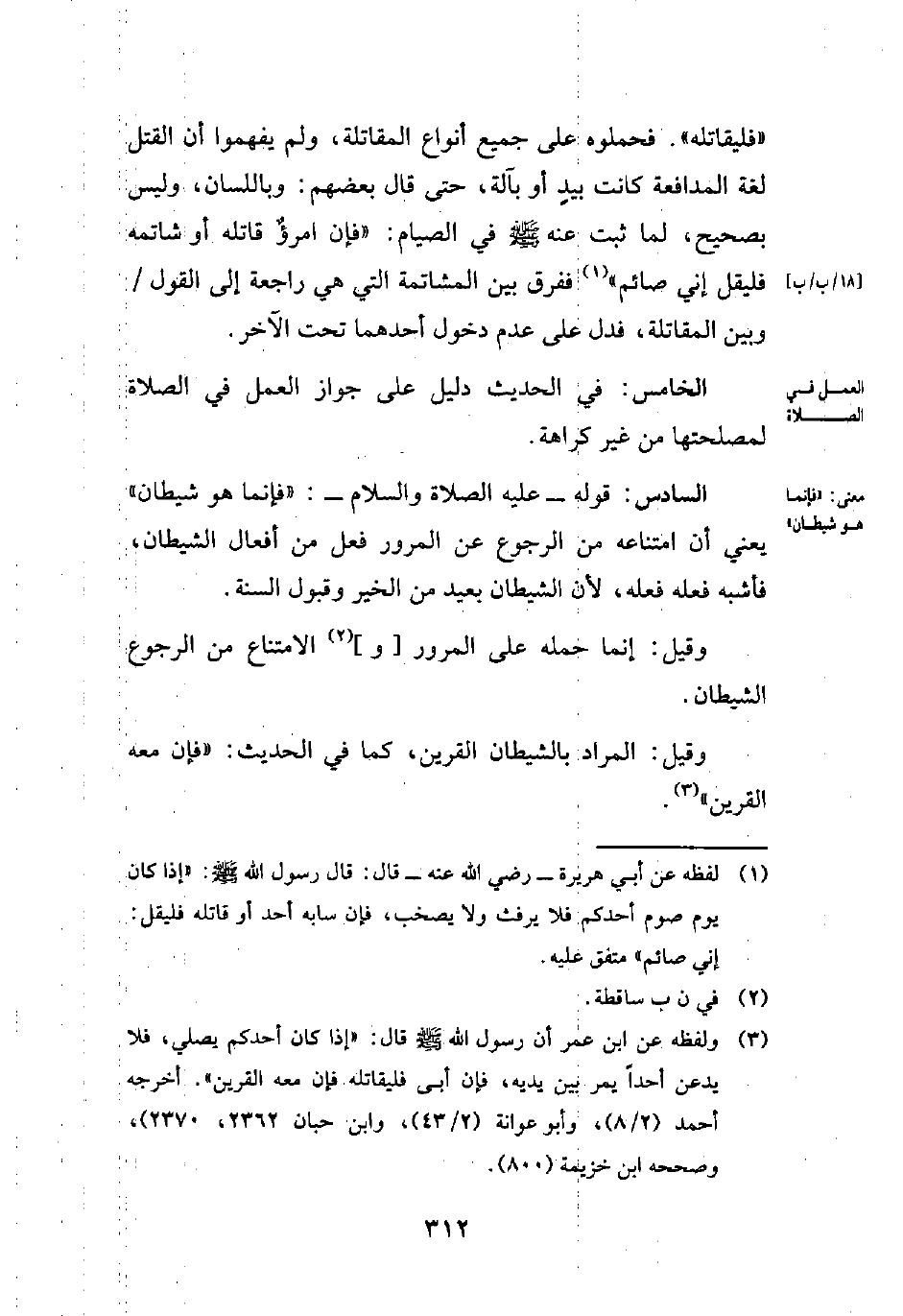 (¬3) ولفظه عن ابن عمر أن رسول الله - صلى الله عليه وسلم - قال: "إذا كان أحدكم يصلي، فلا يدعن أحدًا يمر بين يديه، فإن أبى فليقاتله فإن معه القرين". أخرجه أحمد (2/ 8)، وأبو عوانة (2/ 43)، وابن حبان 2362، 2370)، وصححه ابن خزيمة (800).
